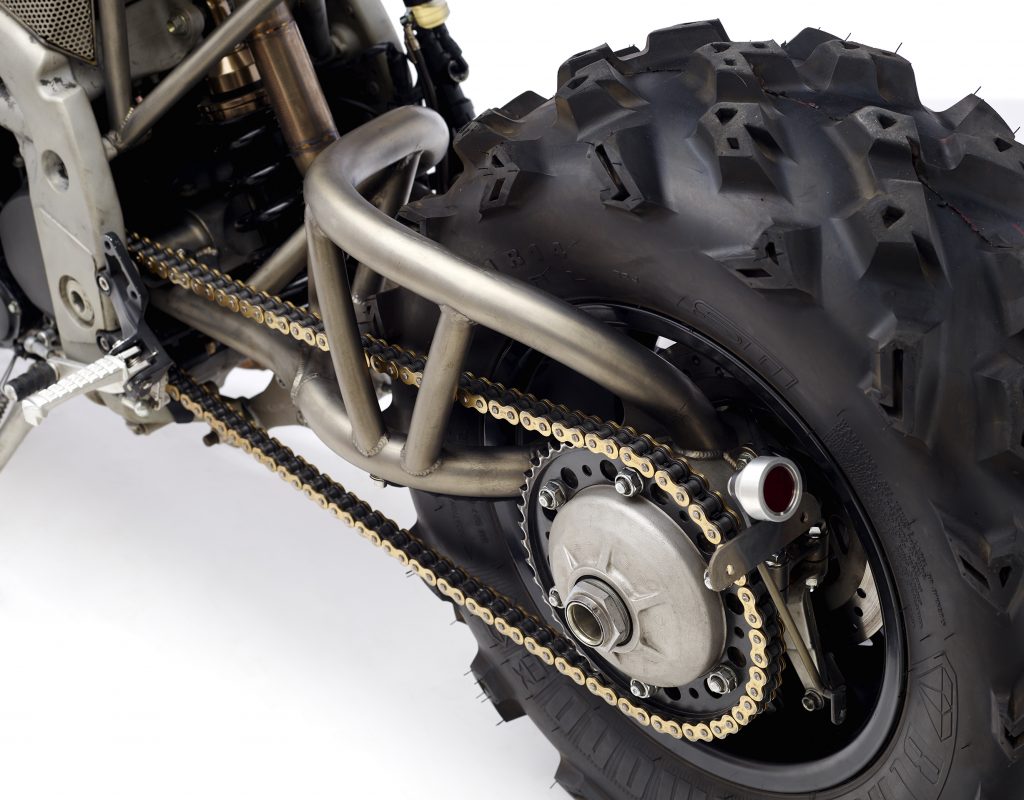 The Classified Moto Frank Motorcycle is a real Frankenstein in terms of design as they set out to use as much of what they had to hand and then build the rest of what they required. It boasts a fully custom, chromoly, single-sided swing arm to accommodate an 11-inch-wide gnarly ATV tire that makes the bike stand out from the crowd from an aesthetic point of view and for those of you that don’t conform to the norm and like your ride to have something about it, the Frank Motorcycle from Classified Moto is a match made in heaven.
