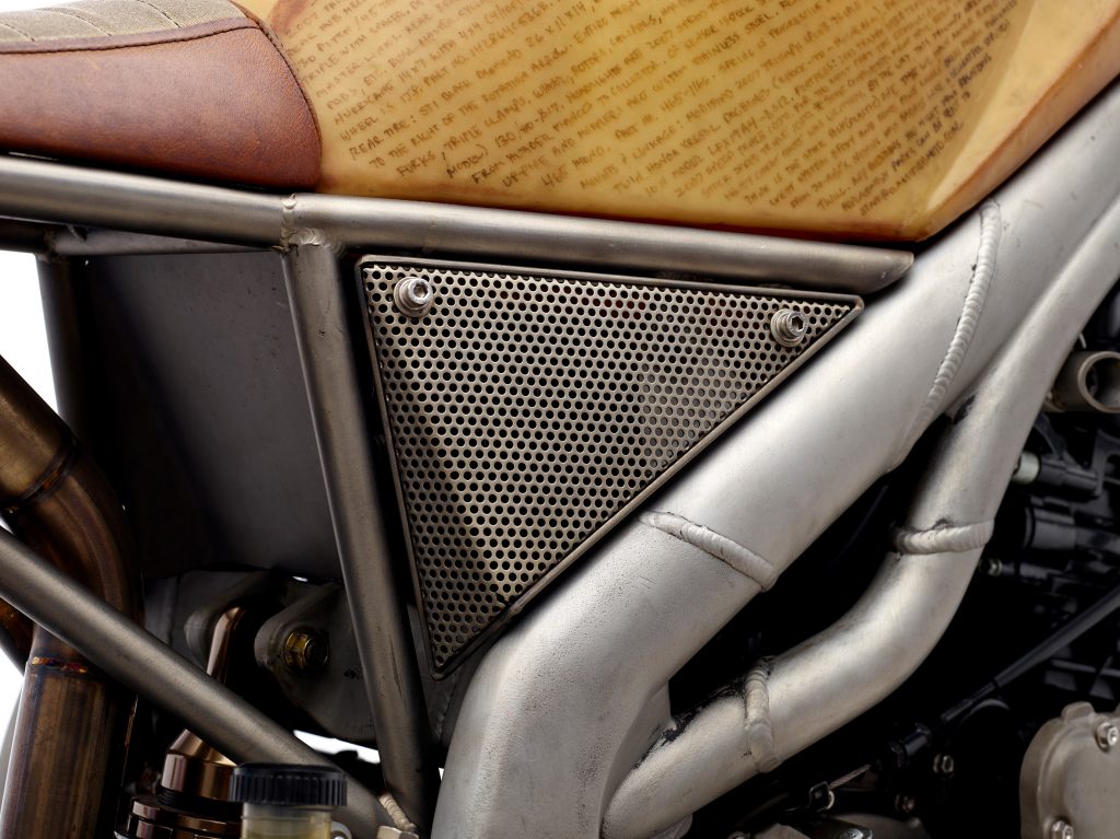 There is a lot going on under the hood with this Classified Moto Frank Motorcycle and Progressive Suspension 465 Series rear shock, a custom leather seat upholstered by Roy Baird, a Shorai lithium ion battery and a 2007 Triumph Speed Triple (glassed) tank. Whilst the aesthetics are the first thing you’ll notice with this bike without doubt, it is no slouch in the performance department and it’s hard not to be won over by the whole package.