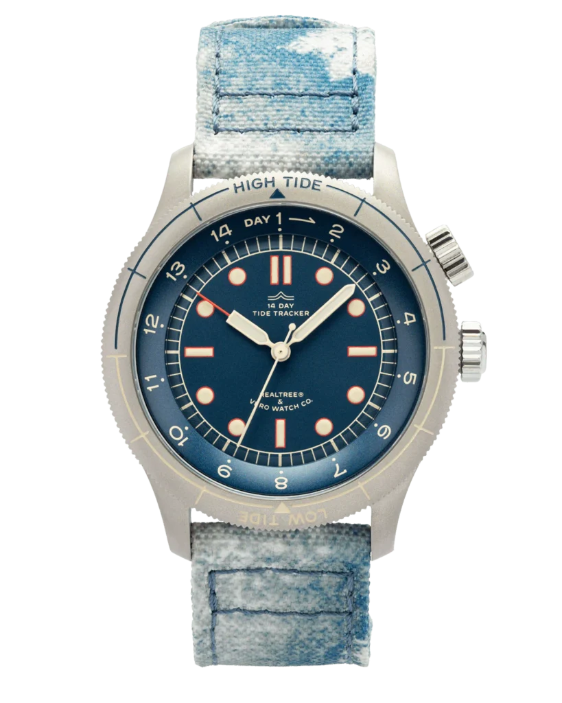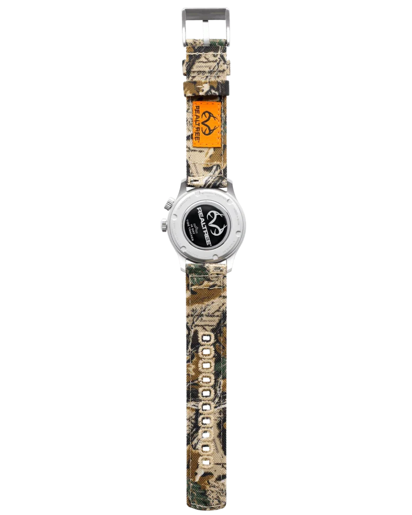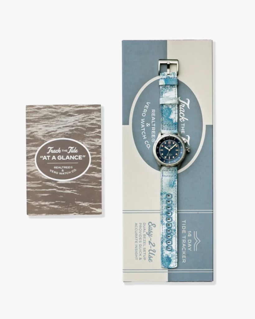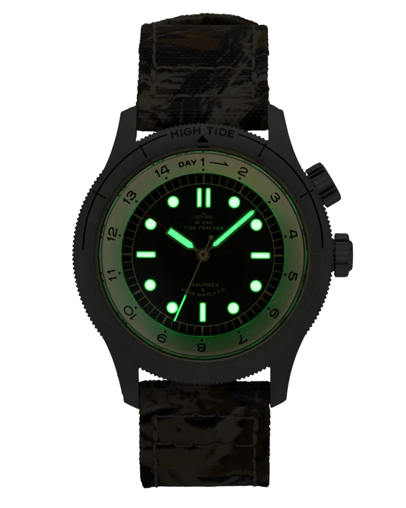 The true genius of the Vero x Realtree Tide Tracker, however, lies in its signature complication. Built for those who move with the water, it features a unique 14-day tide tracker.