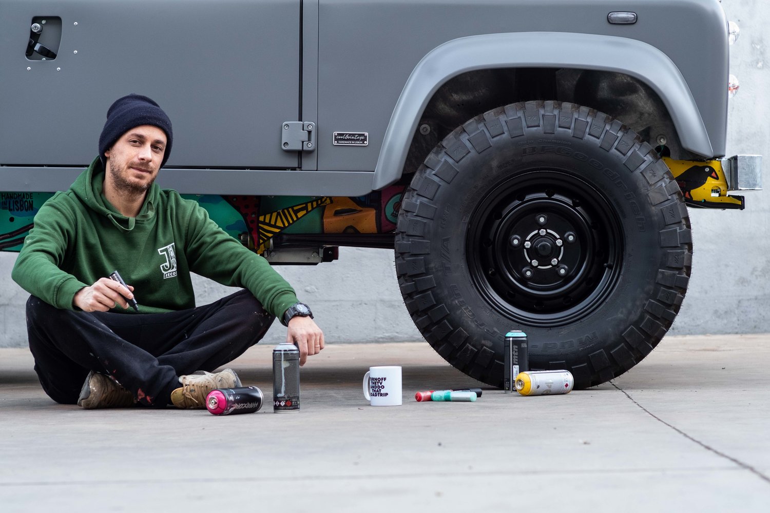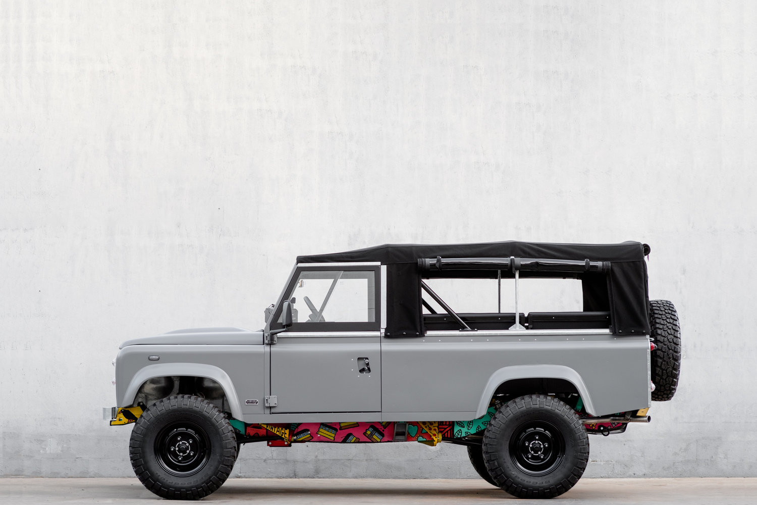 The Cool And Vintage N77 Land Rover Defender has a great contrast of colours with the more understated matte medium grey paint job being coupled with the much more visually arresting artwork from Vasco Costa and it has a black high quality zipper soft top finish which makes it ready and waiting for all your outdoor adventures in 2019 and beyond.
