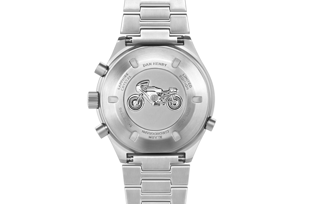 Great to look at, the Dan Henry 1972 Chrono Alarm Watch comes in a number of different styles and each has a large, high-contrast dial and minimalist design. The movement of this exceptional watch deliver an array of complications: an alarm, and chronograph that can measure up to 12-hours, and intervals of 1/10 second measurements. Engraved on the back you’ll find the profile of the Ducati 750 Imola Desmo motorcycle – a tribute to a racing machine that defined speed with elegance in the 1970s. The 41mm stainless steel case of the 1972 in available in your choice of matte or black PVD. With its sapphire crystal, the Dan Henry 1972 is the ultimate tool watch and will turn heads everywhere you go.