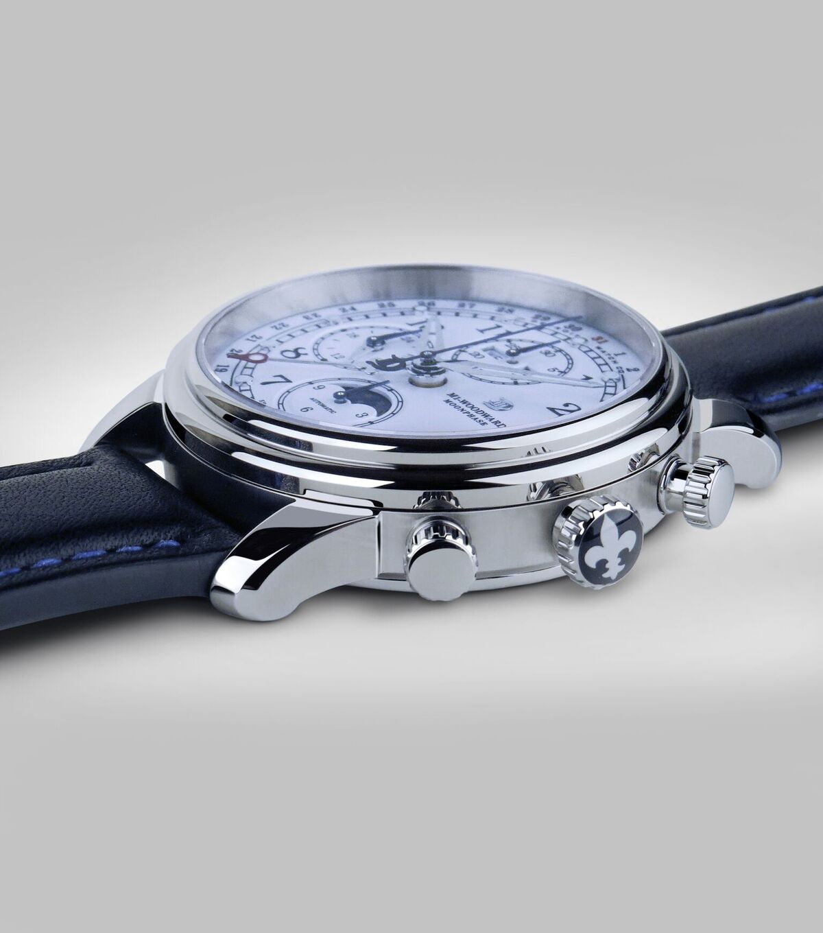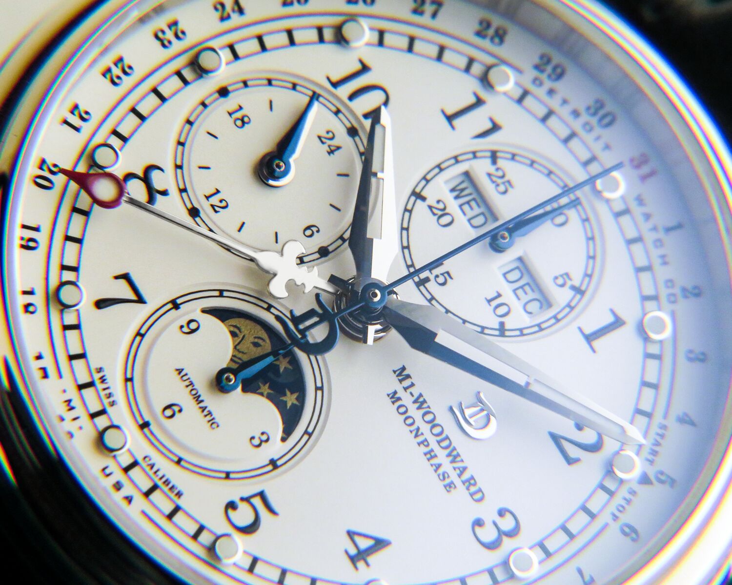 The movement incorporated within the M1-Woodward® Moonphase Timepiece is impressive to say the least and consists of a decorated Swiss Valjoux Eta 7751 Automatic & Manual Winding 25 jewels, Chronograph, Shock-absorber-Incabloc, Nivarox Hairspring, Glucydure Balance, 28800 Vibrations Per Hour, 4Hz and, last but not least, an impressive 48-Hour Power Reserve as well. It has a 50m water resistance and the strap is made of calf leather with deployant clasp and quick release spring bars so it sits perfectly on the wrist.