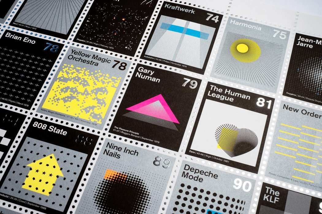 The Electronic Album Stamp Print from Dorothy begins with the 1968 groundbreaking eponymous album by Silver Apples and also features other classics which includes Kraftwerk and their 1974 album Autobahn, Brian Eno and Ambient 1: Music for Airports, Gary Numan and The Pleasure Principle, The Human League and Dare, New Order and Power, Corruption and Lies, Depeche Mode and Violator, Massive Attack and Blue Lines, Aphex Twin and Selected Ambient Workds 85-92, Portishead and Dummy, The Chemical Brothers and Exit Planet Dust, Daft Punk and Homework.