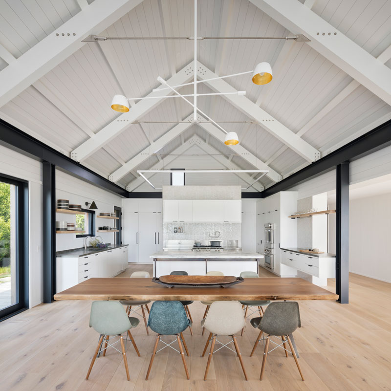 When you head inside the East Lake House, you’ll see a heady combination of rustic and contemporary materials and fixtures which work wonderfully well together. An exposed structural steel frame stretches across large expanses of energy-efficient solar glass, which provides a feeling of lightness while supporting a series of heavy solid wood roof trusses, which have been painted white.