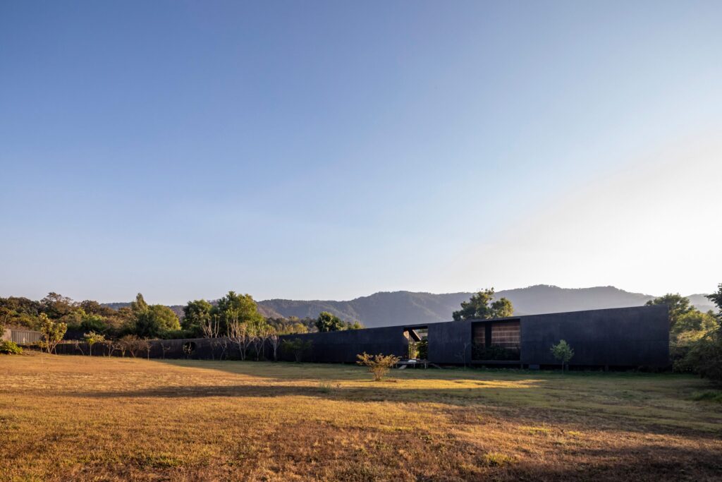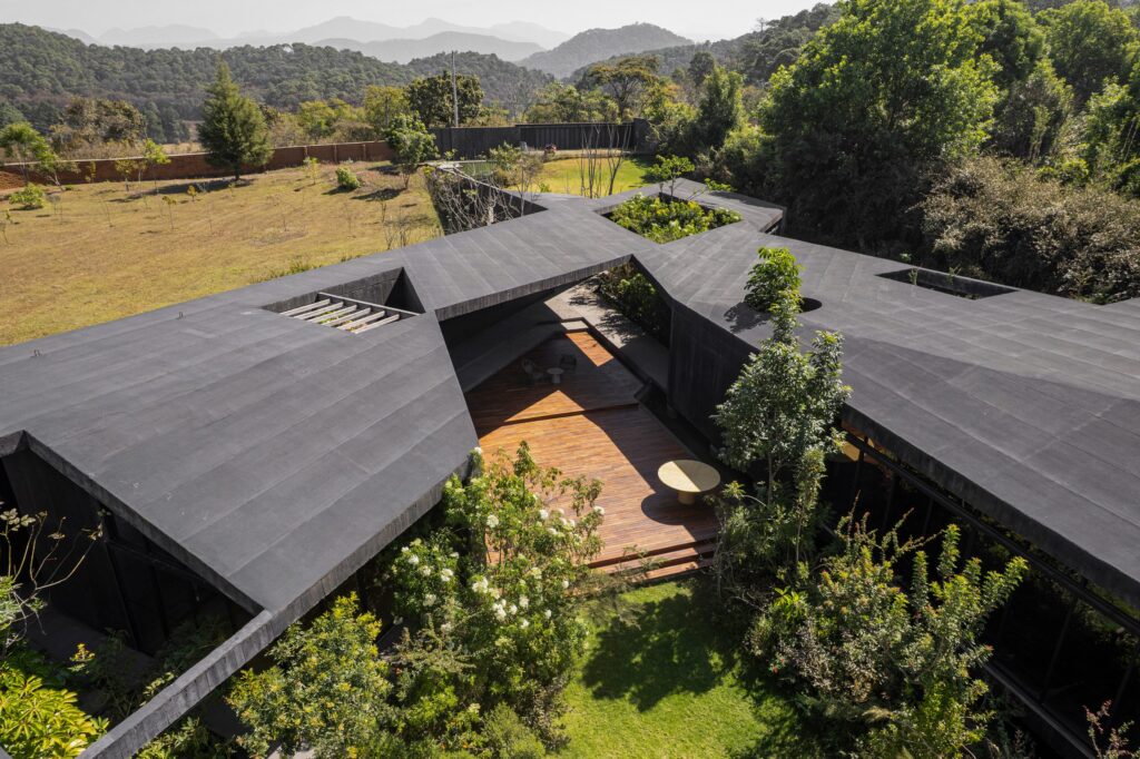 Rather than erecting a towering structure that aggressively competes with the ancient woodland canopy, the team at TAC meticulously crafted a low-lying, highly geometric form. Constructed primarily from black-pigmented concrete, Casa Mavra is brilliantly envisioned as a stealthy “sculptural architectural object.”