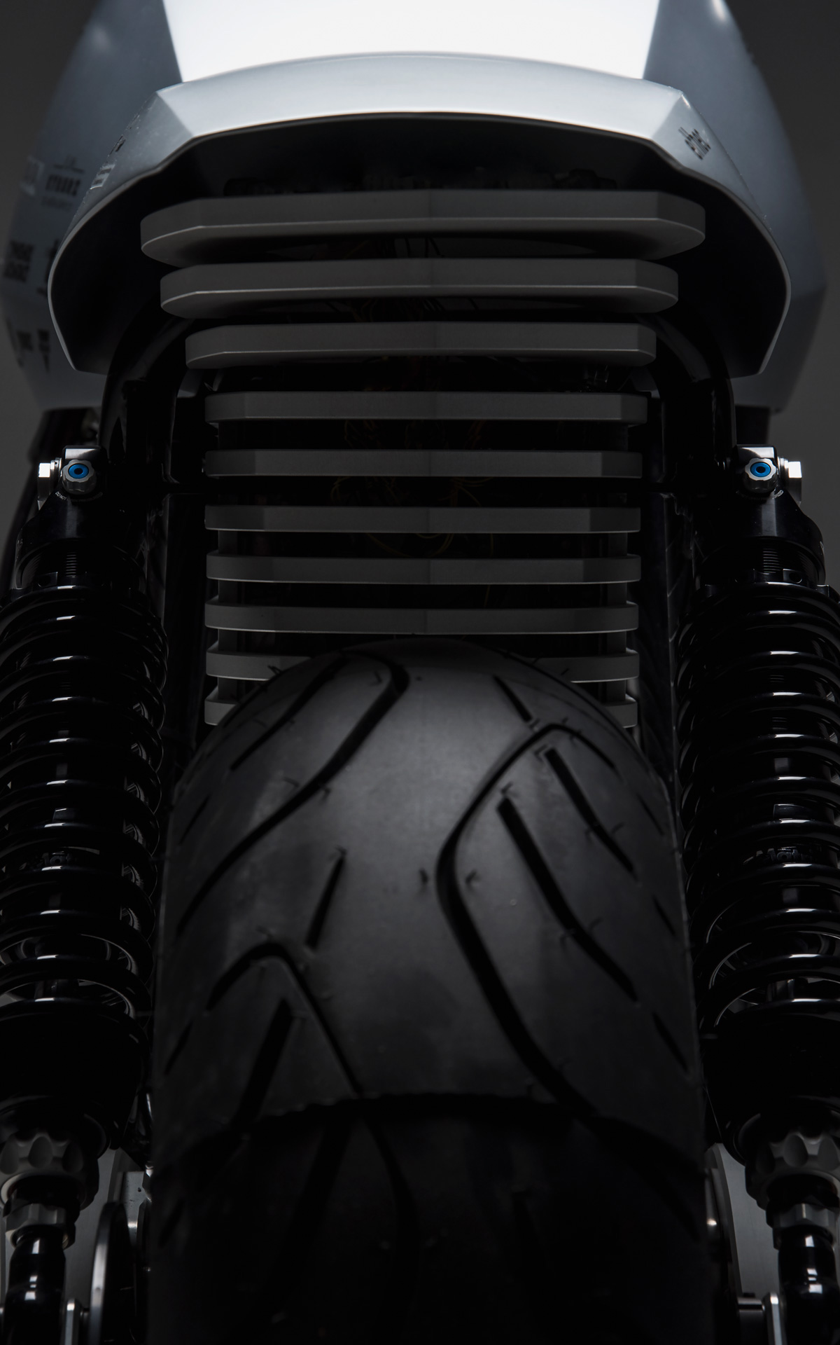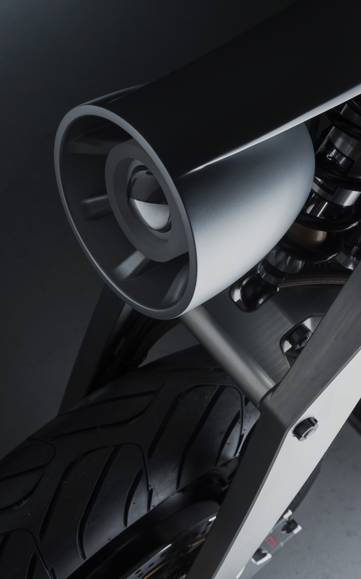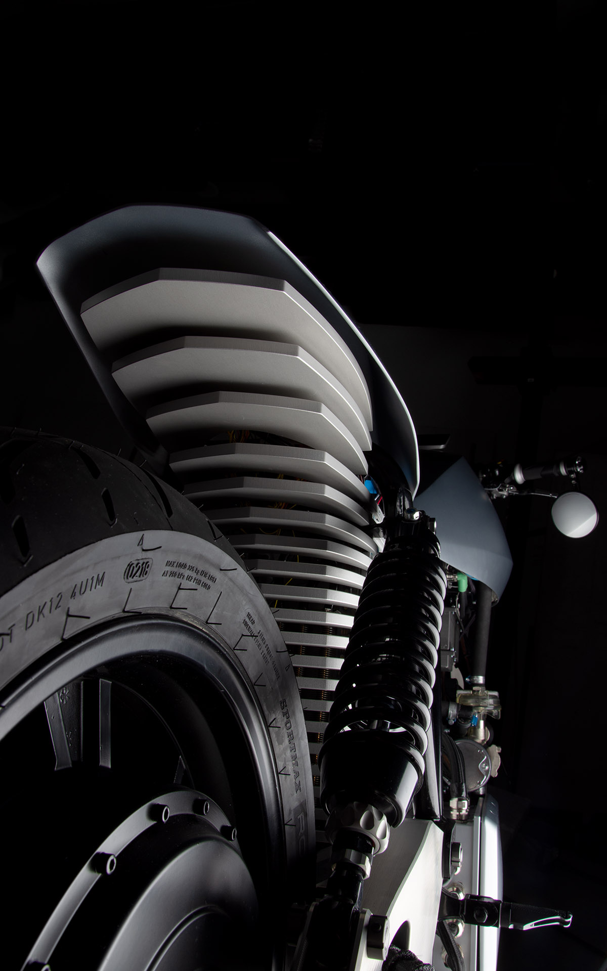 The headlight, attached to the collar, is a key visual element of the Ethec Electric Bike and it characterises the head of the design. The prominent expansion of the shoulders gives the motorcycles’ front view a powerful aesthetic and the slim seat represents the waist in front of the broadening rear, which finalizes the shape of the monobody. The whole design is kept flat and leaning to the front, which does a great job of underlining the dynamic appearance of the motorcycle even when it’s not being driven.