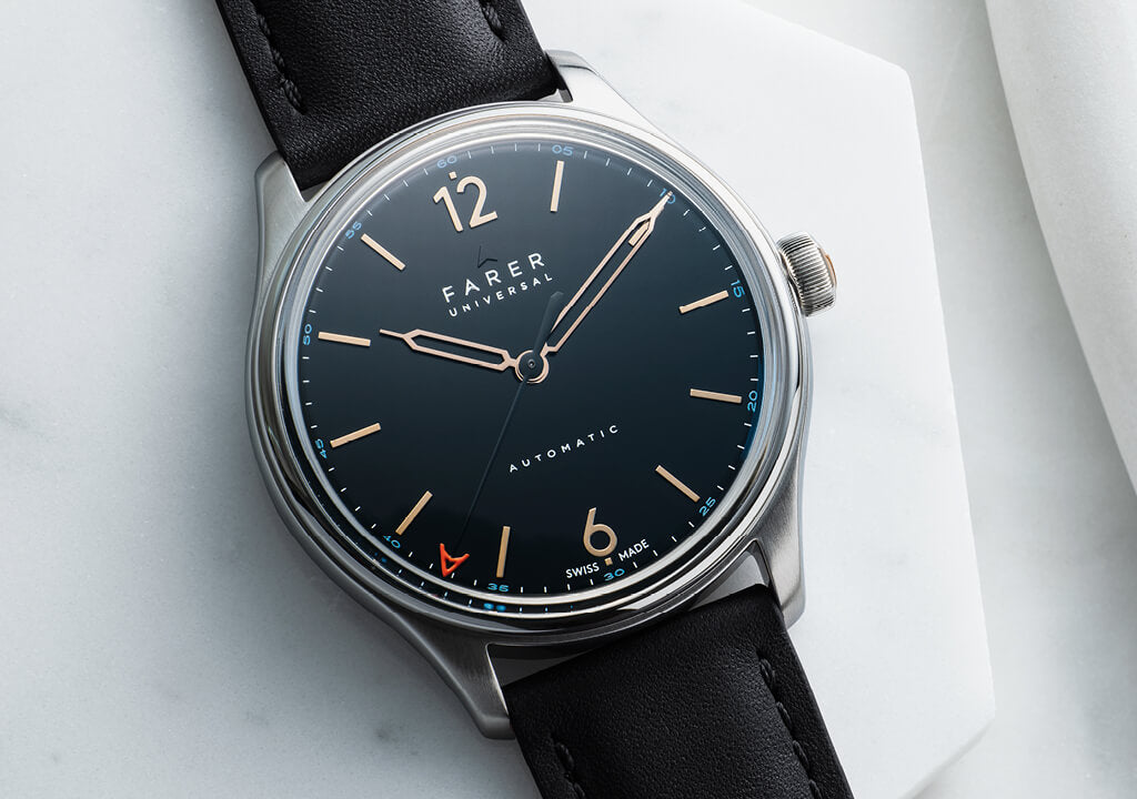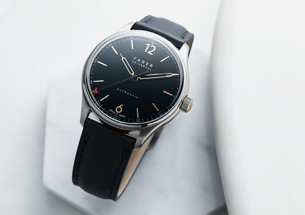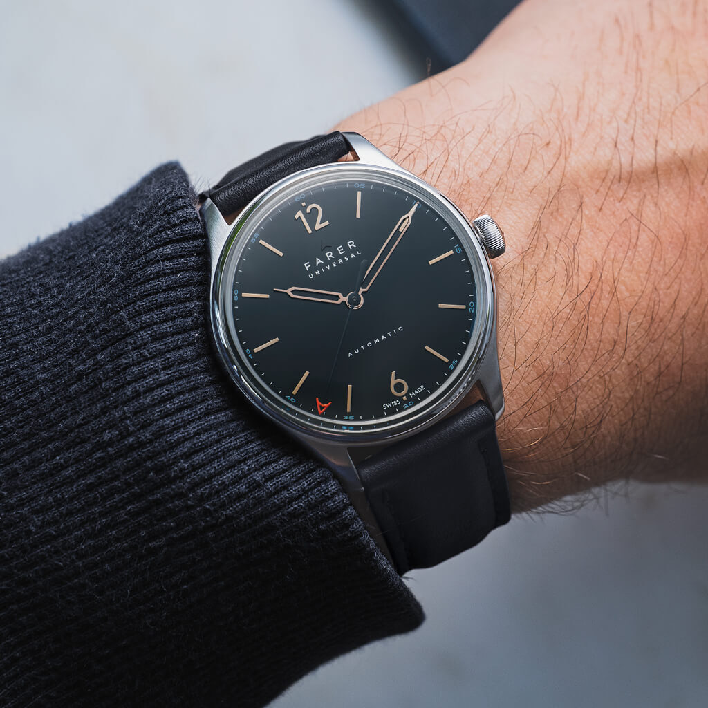 Effortlessly cool and stylish, the Farer Erebus Automatic Watch (£790) has an on outer open track in sharp white with five second numeric numbers in mid blue which deliver the impactful second look contrast. But the playful pop of colour has been carefully kept in reserve for the Farer ‘A’ tip of the sweeping seconds in signal red, which appears to float on the end of the polished black hand, completing the contemporary classic design of this glorious looking timepiece.