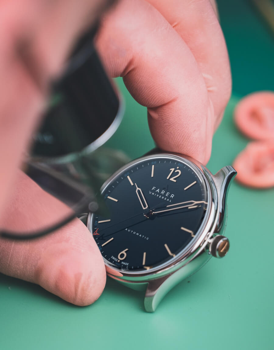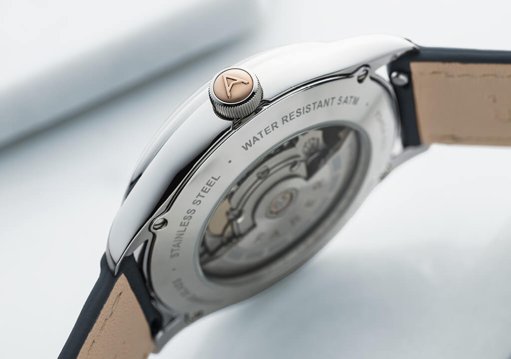 The stand out design feature of the Erebus Watch from Farer is the visually captivating, silk gloss dial which will immediately draw the eye of all who see it. It is so striking courtesy of the pitch black mirror-like finish that plays with the light – with every move opening a new look on your wrist. The two layer, internal anti-reflective, boxed cased sapphire crystal domed glass is also important because it allows the dial to shine without creating any glare across the crystal itself.