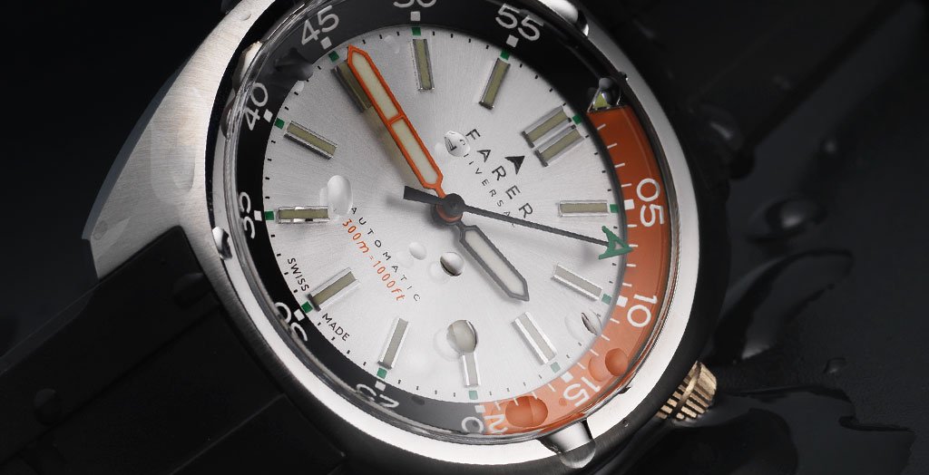 The Farer Leven Watch (£1095) has an outer unidirectional bezel which is finished off in silk matte black with overprinted white numerals in five-minute markings and zero arrow, with a 20-minute detailed scale for decompression times highlighted in burnt orange. The Leven Watch from Farer expertly combines functional design with vibrant use of colour to give the timepiece a unparalleled visual impact that we’re loving here at Coolector HQ.