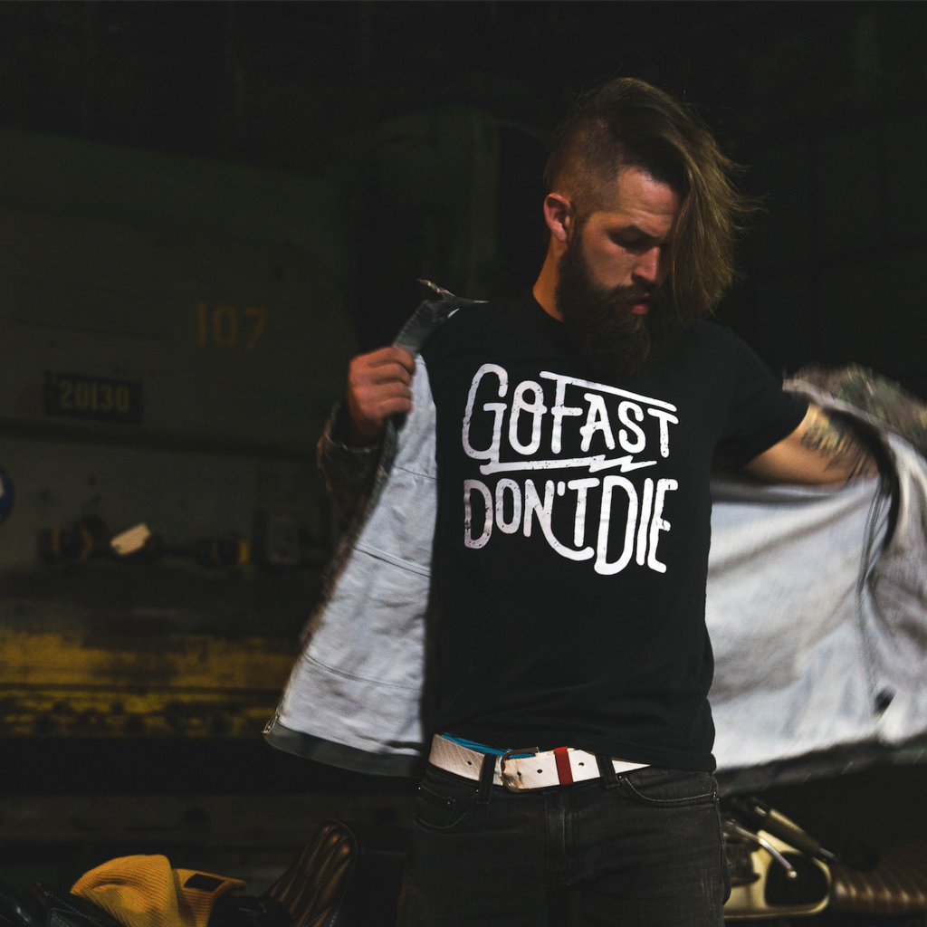 It is probably pretty clear that when it comes to the T-shirts and apparel we gravitate towards here at Coolector HQ, there is a certain moto vibe to it and that’s why brands like P & Co and The Bike Shed are prevalent features on our pages. For this reason, we’re always on the lookout for moro-inspired clothing brands and we’ve just come across a bit of a belter in the shape of Go Fast, Don’t Die Apparel who boast a mighty impressive line up of tees and accessories which your wardrobe will be calling out for this summer.