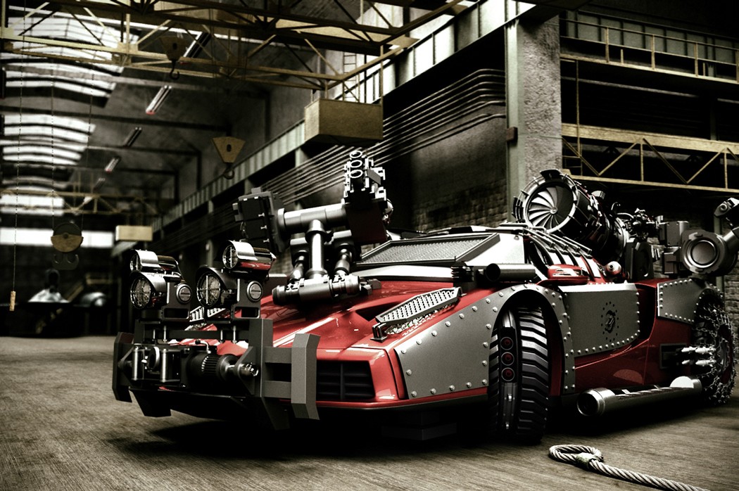 Though it patently isn’t a machine that is in tangible existence, it is unquestionably one suited to the rigours of Scorched Earth (well, perhaps not given the desert terrains, thinking about it) and in a pinch looks like it would get you out of danger in multiple different ways. Take a look at a few more shots of this madcap concept below: