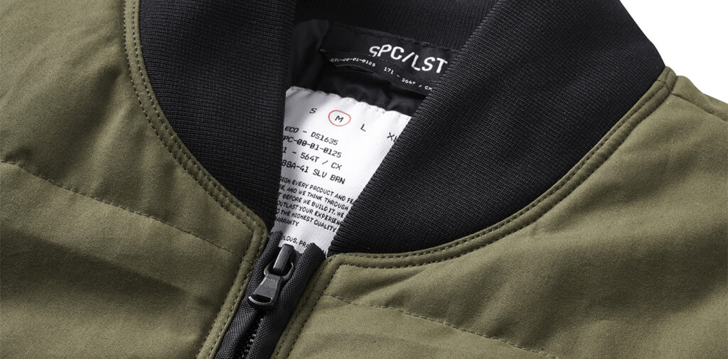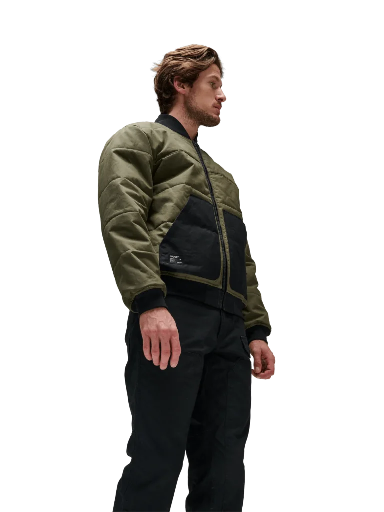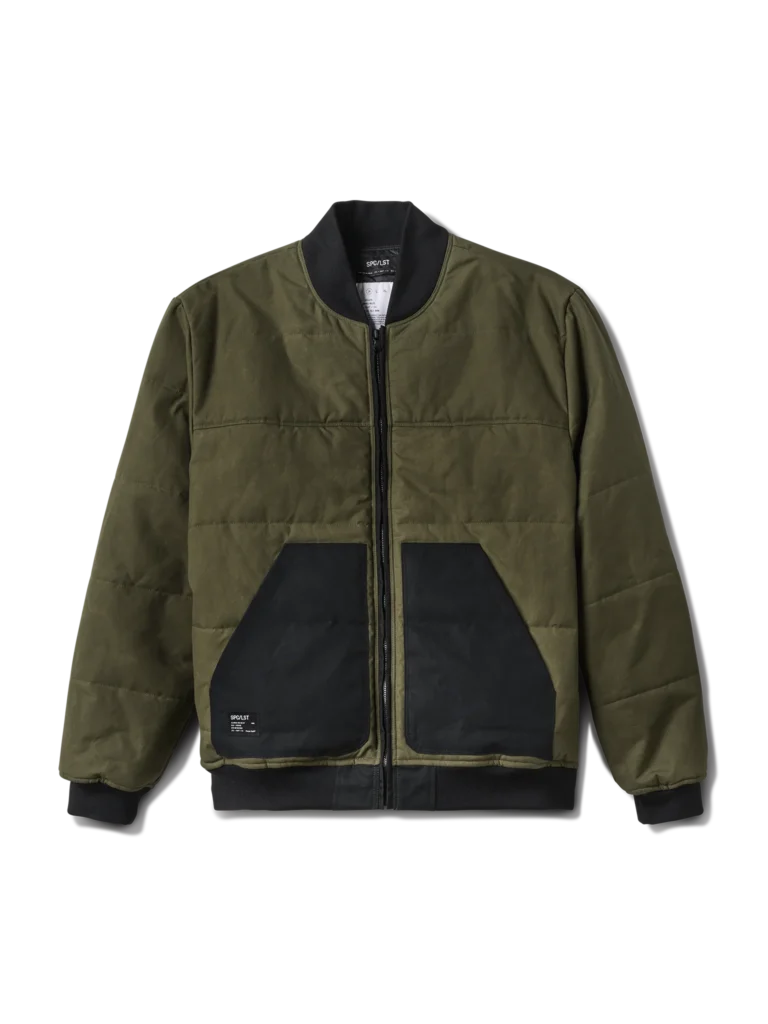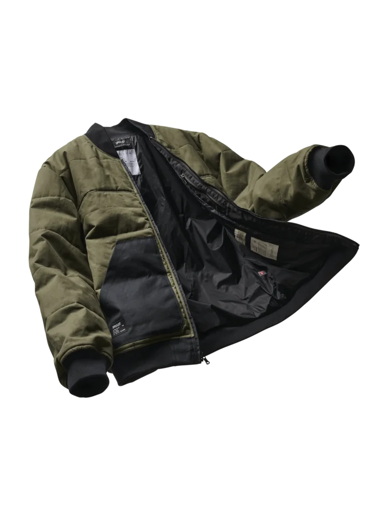 This desperate need for warmth and mobility evolved into the iconic MA-1 flight jacket—famous for its cropped length, knitted collar, cinched cuffs, and that legendary rescue-orange lining designed to signal help if a pilot went down. It is a piece of history that has been reinterpreted a thousand times, but rarely has it been reimagined with the material sophistication of the SPC/LST Encounter_01J British Millerain® Waxed Bomber Jacket.