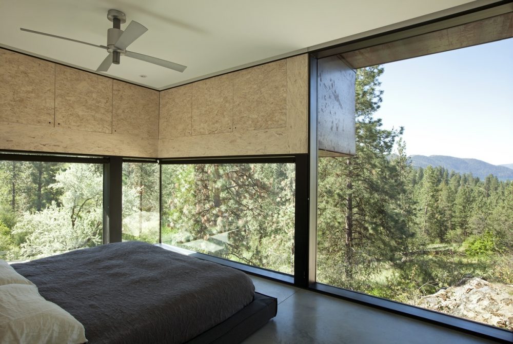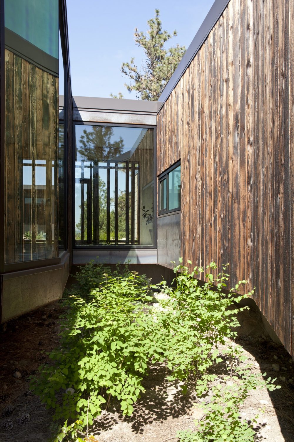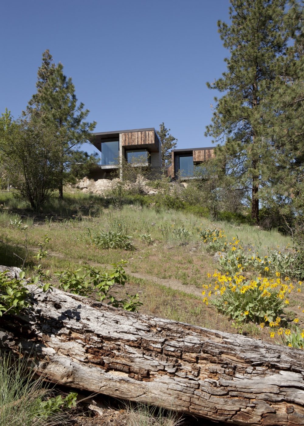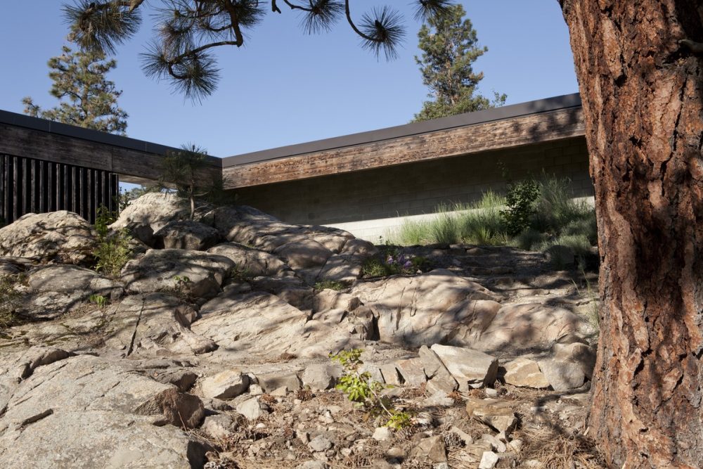 The Friesen Wong House from D’Arcy Jones Architects is positioned upon a rocky knoll, at the edge of a uneventful looking cul-de-sac amid the treed and free flowing topography of the Kalamalka Lake Provincial Park in Canada. Inspired by a rich and varied history of cattle rustling and gold prospecting, the home consists of a combination of burned fir planks, raw concrete blocks and steel sheets which all come together to create a conglomeration of rooms unified under a planar roof.