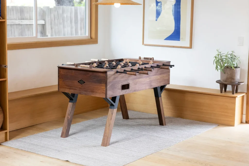 The traditional, soulless red and blue plastic players have also been entirely scrapped. In their place are completely bespoke, hand-turned players carved from solid maple and rich walnut, literally pitting two beautiful natural hardwoods against each other on the pitch.