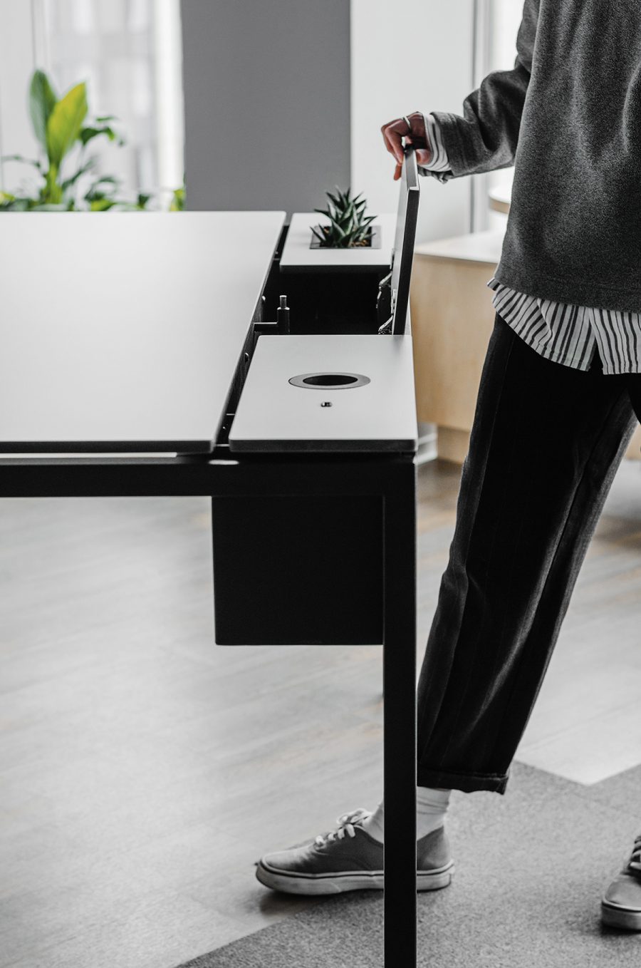Designed with the tech inclined in mind, the G Table has a charging point specifically designed for Apple laptop chargers which is closed with valves and an integrated adapter for chargers, stationery, everyday carry essentials or even flower pots if you want to give a nature vibe to your workspace. The G Table has magnetic pad which will fix the cable from the hatch in the floor and make sure the visual impact of the table isn’t impacted by unsightly cables.