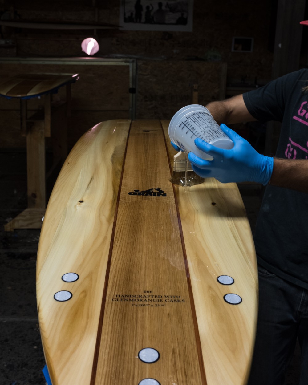Replacing marine plywood as the interior of Grain’s boards has always been an objective for the brand. And through using repurposed barrel staves they hit every goal they had for this awesome collaboration project. Add to that a tailblock and custom fins made from staves, and Grain rightly feel proud to put their name on each board that they build alongside the team at Glenmorangie.