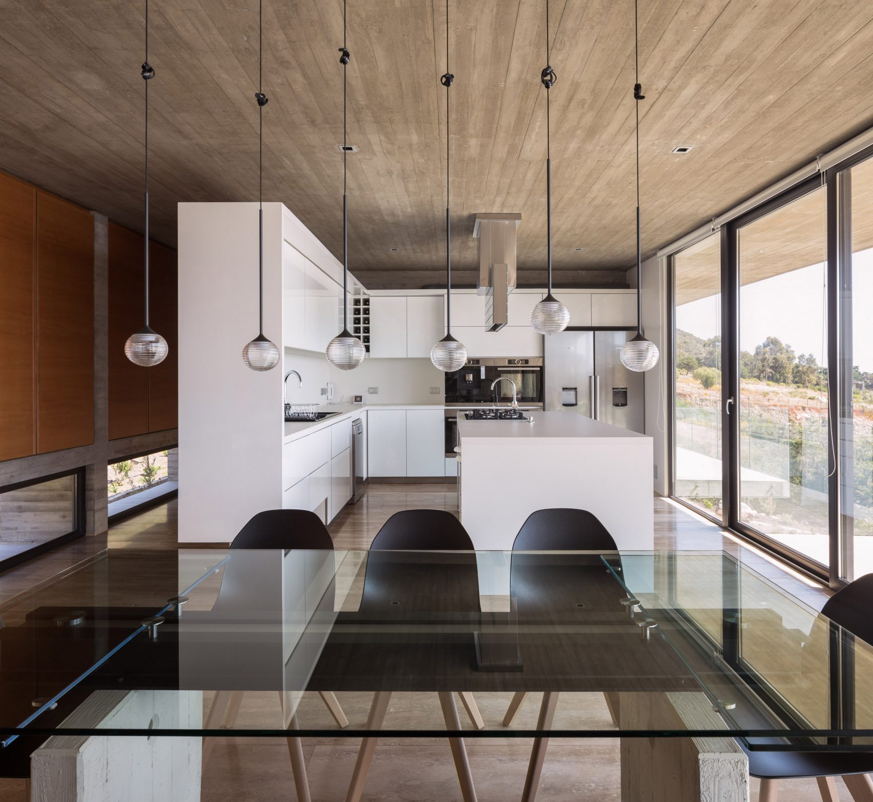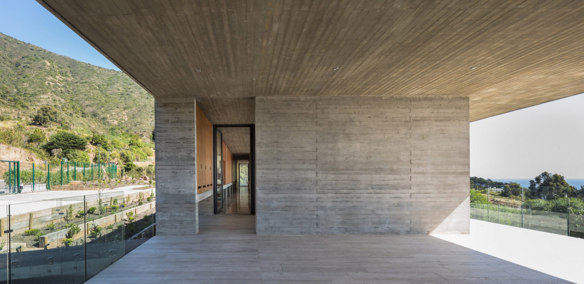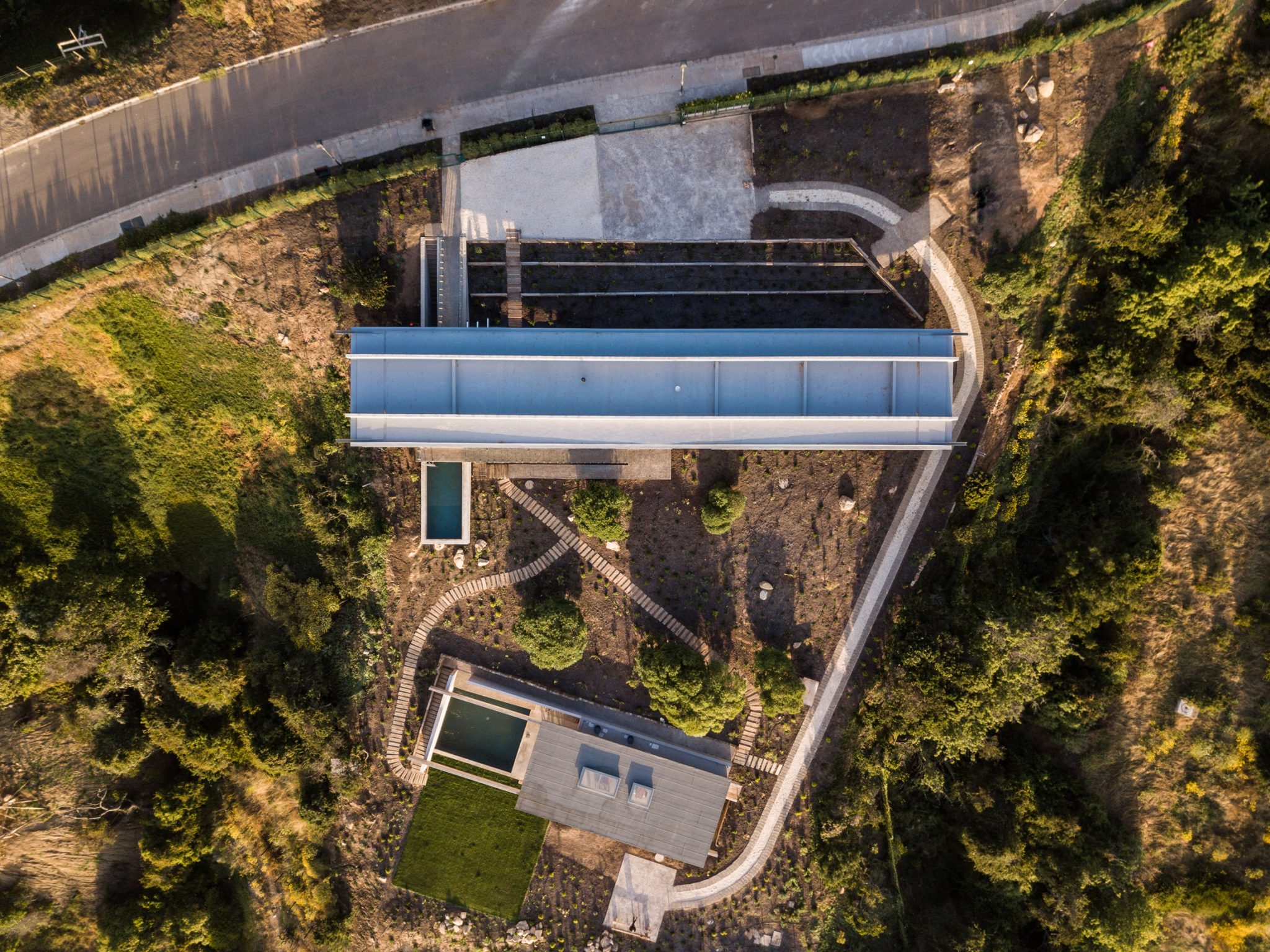 The Felipe Assadi Architect designed H House has two floors and it is raised off the inclined ground, which allows for a highly functional and striking passageway to weave its way underneath the property in order to connect the different levels of the home. It has been made from reinforced concrete, and has two substantial beams which run the length of the roof and the first floor to provide additional structural support to the dwelling.