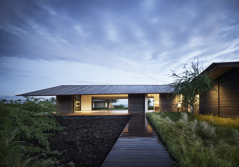When lit from inside at night, the open gaps give the buildings of Hale Mau’u a resemblance to warm glowing lanterns and this delivers quite the impactful visual statement so far as the architecture is concerned. The plot is unique in its capacity to capture the ocean view and mountain view at the same time. The arrangement of the buildings had three main objectives: namely, to catch the mountain view, catch the ocean view, and then block the view of the neighbouring houses. Mission accomplished.