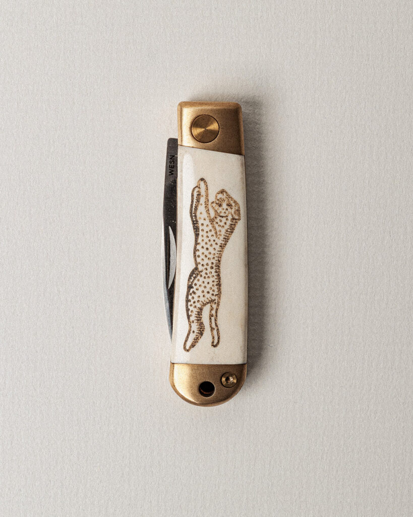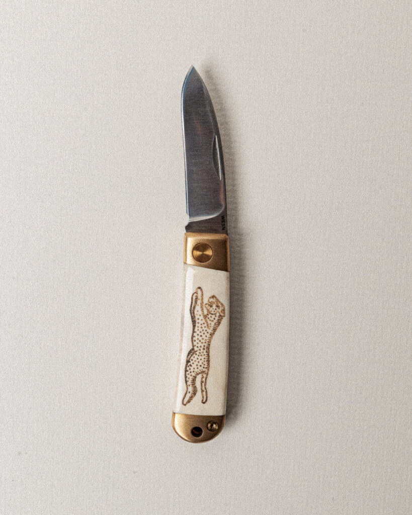The standout feature is immediately apparent: an ethically sourced ox bone handle that serves as a creamy, organic canvas for the knife’s unique aesthetic. The handle features a custom “Wildcat” leopard design, a motif that channels the rebellious spirit of traditional tattoo flash art while nodding to the ancient maritime art of scrimshaw.