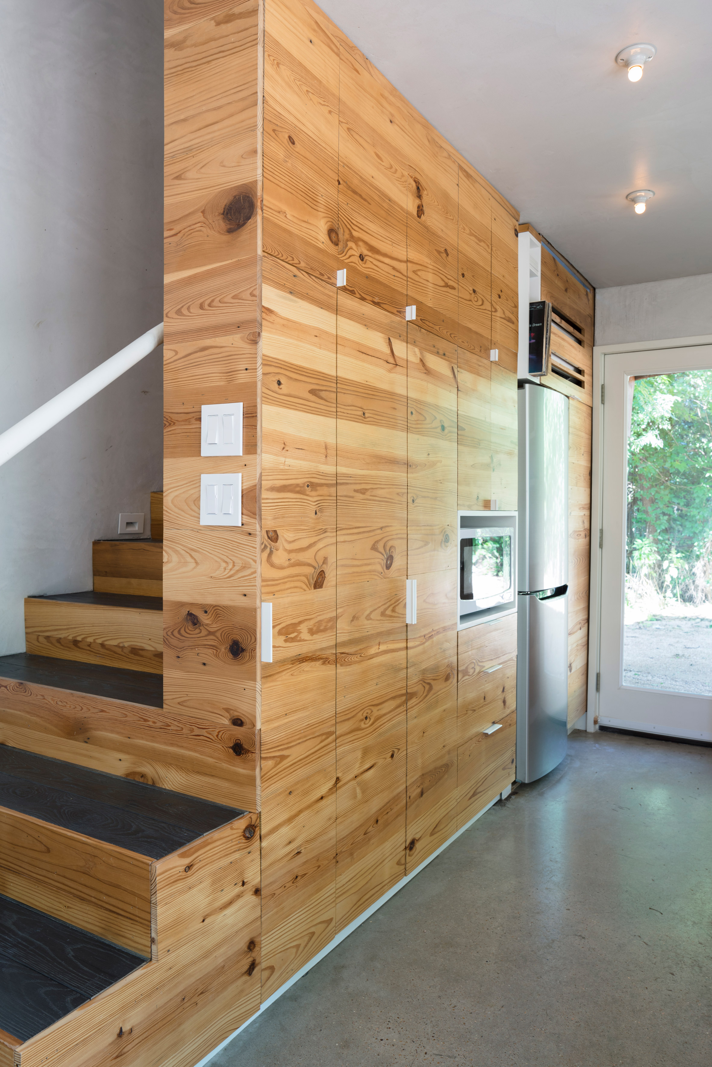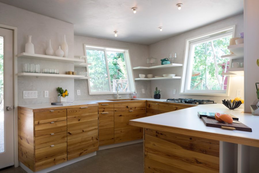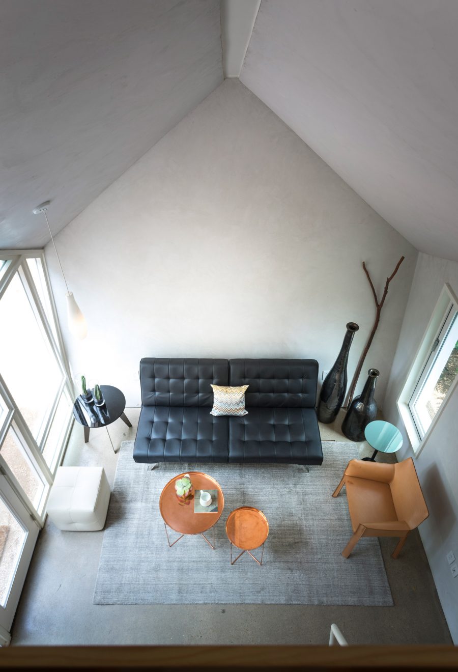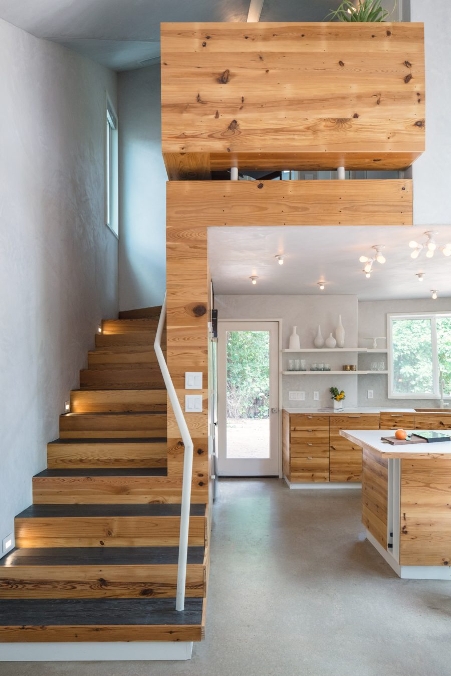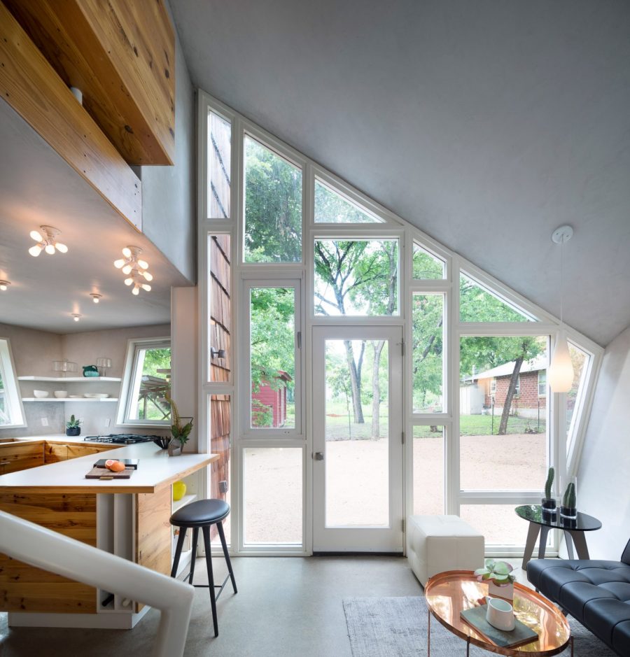 The Hive Guest House in Austin has a highly irregular shape which was conceived as an intriguing response to local design rules – namely, the fact that the city required that the footprint of this guest house be no larger than 320 square feet (30 square metres). To facilitate the creation of a larger dwelling, Studio 512 added a floor and incorporated walls that slant outward and thereby not counting as part of the building’s overall footprint. The Walls tilt from the slab, which hug the building setback planes and an angled utility easement at the rear of the structure, to add volume where needed and given the impression of a beehive.