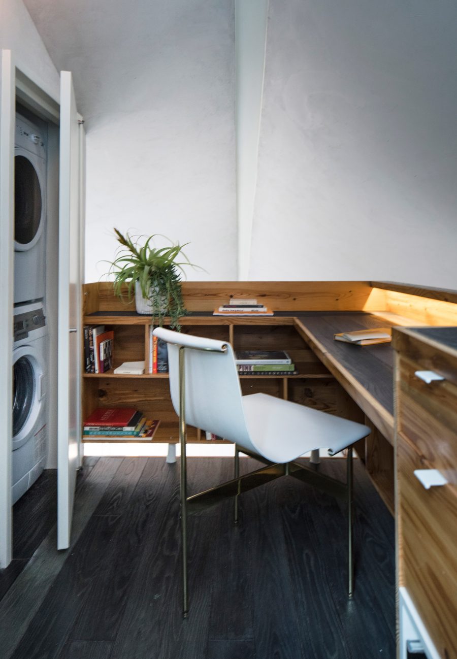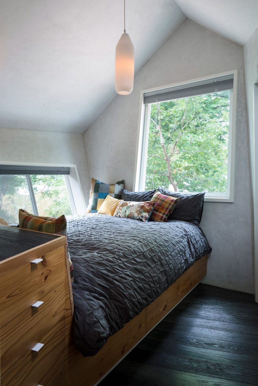 With the exterior walls being clad in large cedar shakes that were crafted using old roofing material, there is an aesthetic appeal to The Hive quite unlike anything else out there. It has differently-sized windows which have been framed in white and bring a pleasing amount of daylight into the compact guest home. The rooms within widen and narrow, depending on how the space is being used and according to Blair, this strategy was influenced by the principles represented in the Vitruvian Man, the famous 15th-century drawing by Leonardo da Vinci.