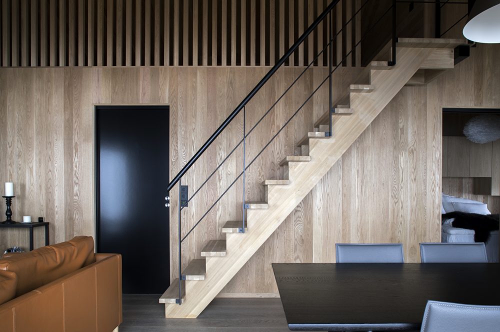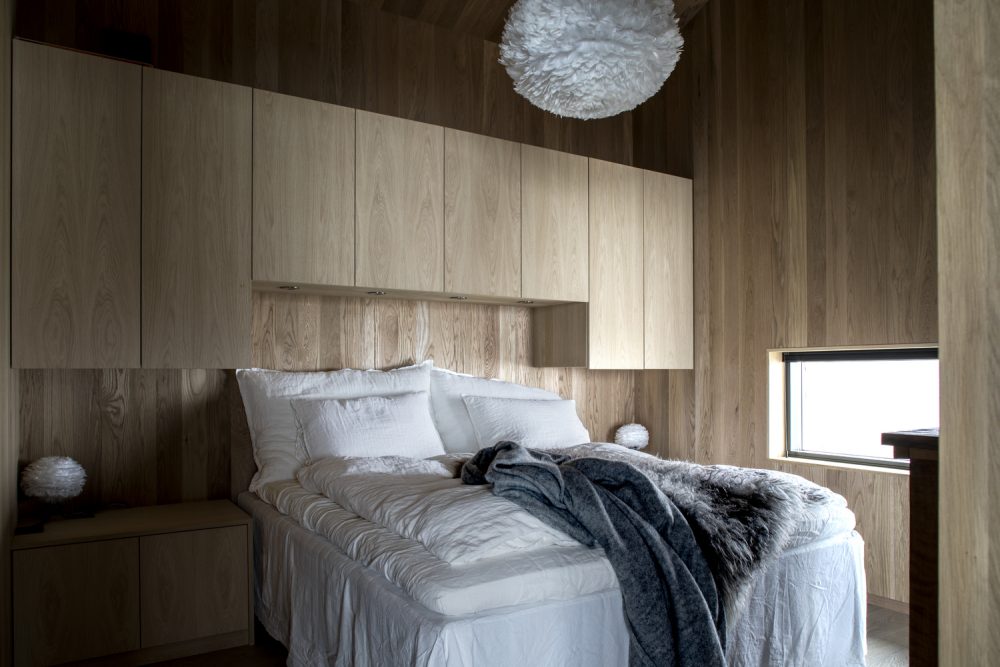 As you might expect, there is a distinct minimalistic vibe to the interiors of the Hooded Cabin and you’ll find oak flooring and paneling which serves to reflect the natural colours from the surrounding mountainside. In the rear of the cabin, there is a master bedroom, bathroom and a sauna that manages to doubles as a guest room due to some innovative design endeavours. Above the rooms there is an open attic that offers sleeping space for 8 people.