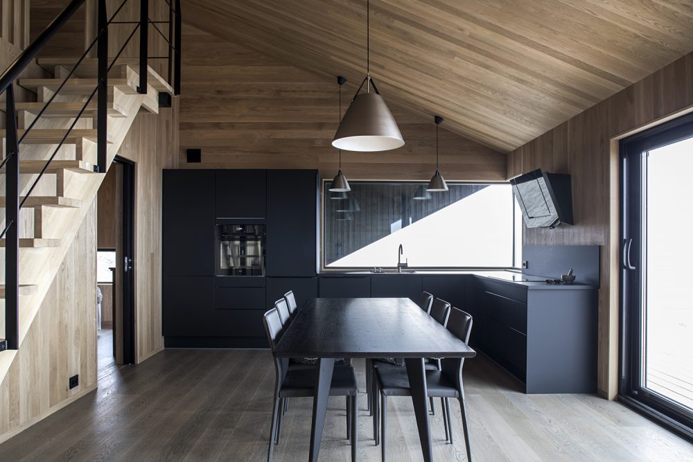 The Hooded Cabin from Arkitektværelset As is so-called because of the protective hood of the roof which aims to shield the property from being buffeted by the elements which are so apparent on this Norwegian island. The ore pine roof helps shield the “eyes” of the cabin in the front, and prevents rain from trickling down the main entrance into the cabin. The roof design has obvious practical functions, but at the same time, the contrast between the angled pine paneling and the black painted cabin body delivers a bold visual impact.