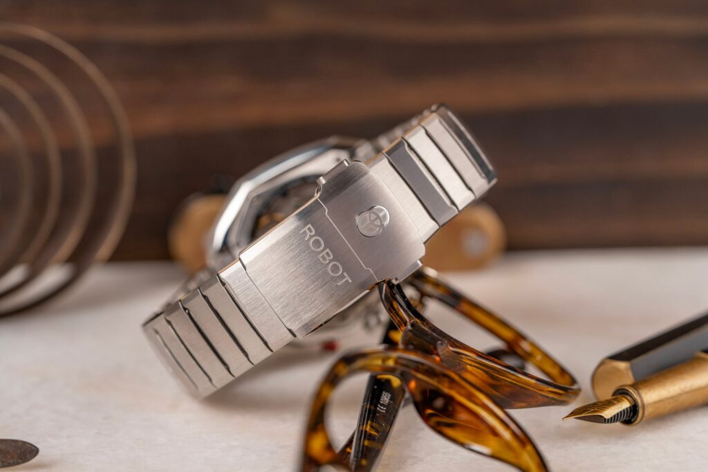 Eilinger was tasked with fusing local storytelling with high-end manufacturing, and he delivered in spades. The Robotic One is defined by its incredibly unique, asymmetrical case silhouette, which was explicitly inspired by the shape of a stylized robot head.