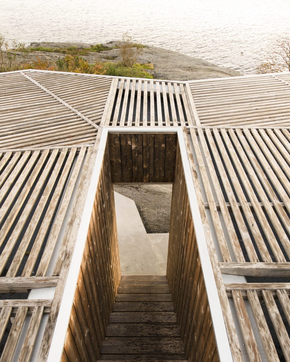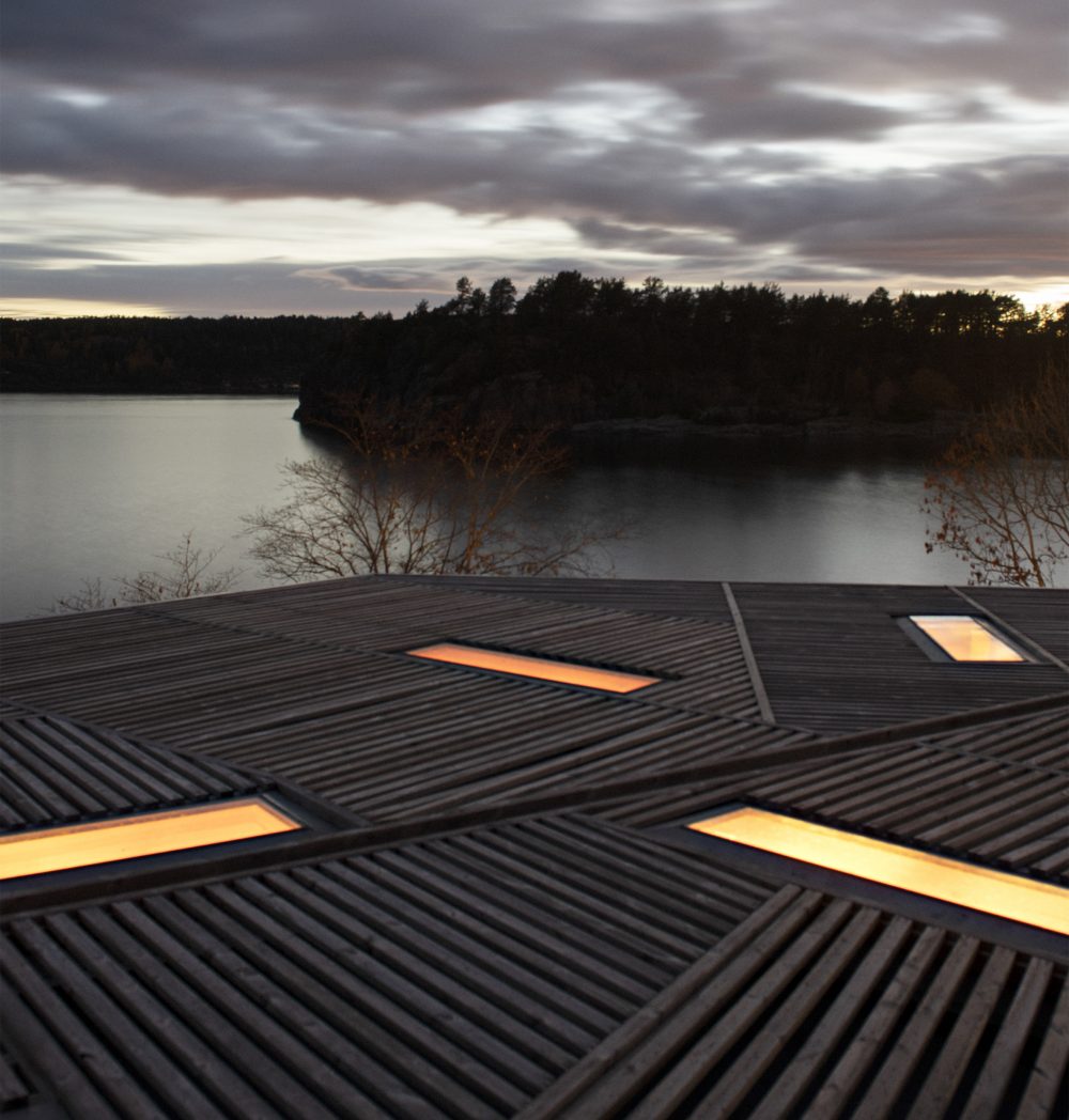 There is a highly distinctive aesthetic to House on an Island and this was inspired by the feeling you have when sitting under a tree, with the rays of sun filtering through the branches. This makes the residential property highly relaxing on a sunny day and as the property is fully glazed, the wooden structure also works as sun-shading and provides a sort of frame for the amazing views. Towards the neighbours and south, the wood cladded exterior is more closed but it doe open up towards the sea and the horizon to enhance the sense of warming relaxation within.