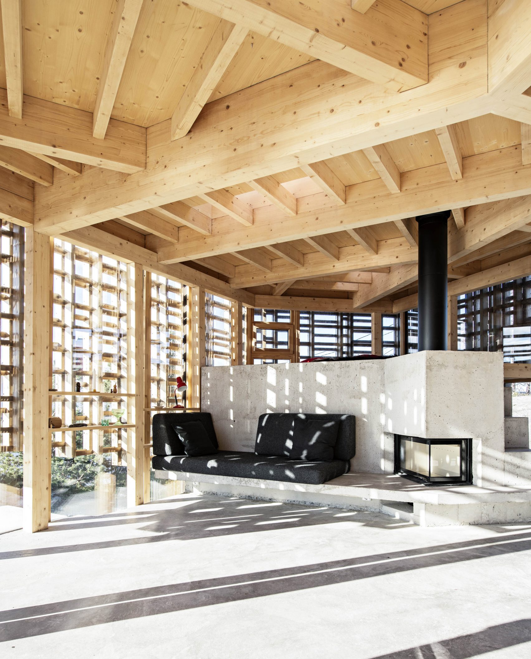It’s not just the exterior of House on an Island that scores highly, it’s equally as impressive on the inside. The cabin consists of an open-plan living room and kitchen, joined by a bathroom, two bedrooms and an office space for the artist owners to work. In the living space, the architects, Atelier Oslo, have used concrete to create a ruin-like structure that grows out from the building’s concrete floor. It boasts a bench, fireplace, and a day bed that is elevated on a micro-mezzanine level for a more functional and versatile living space.