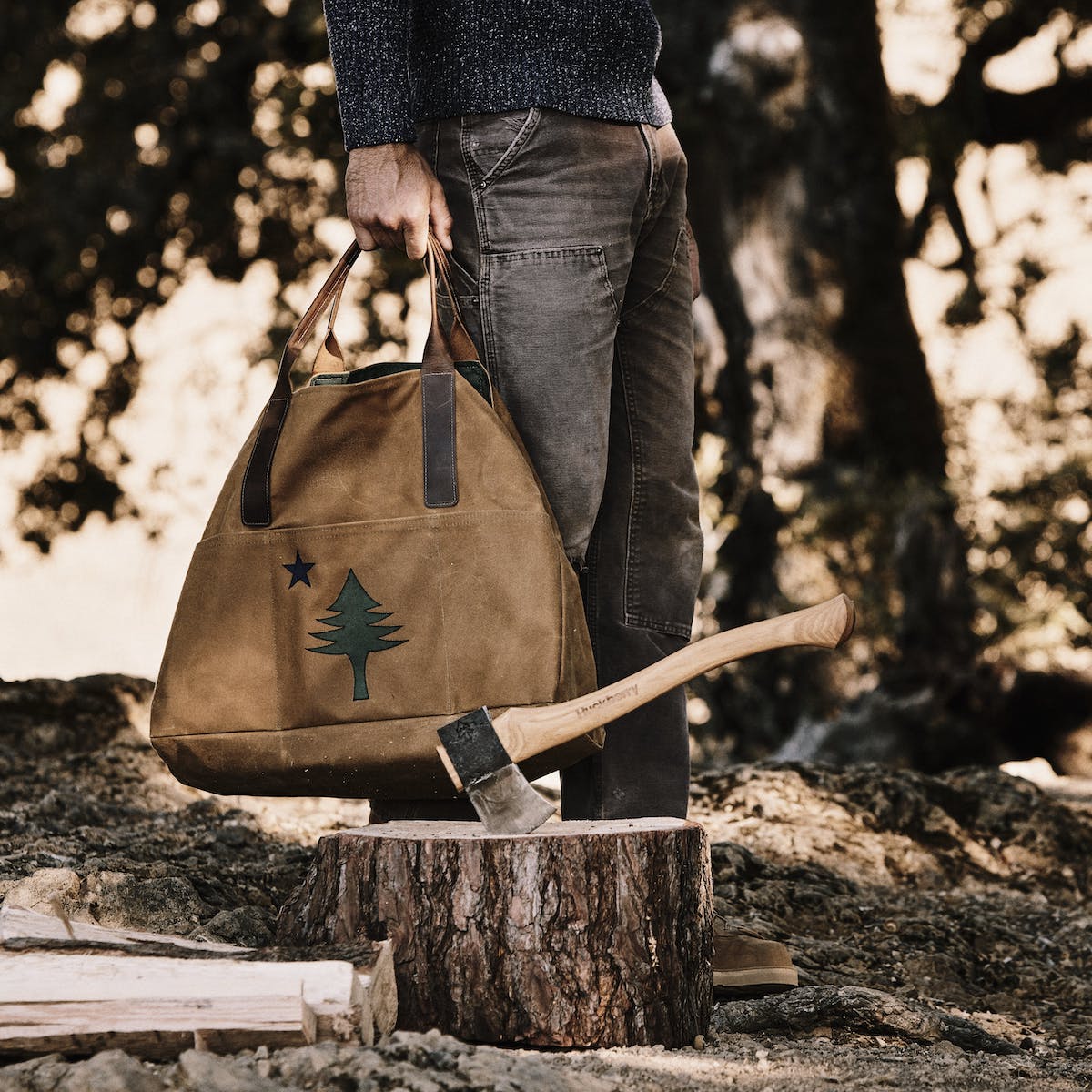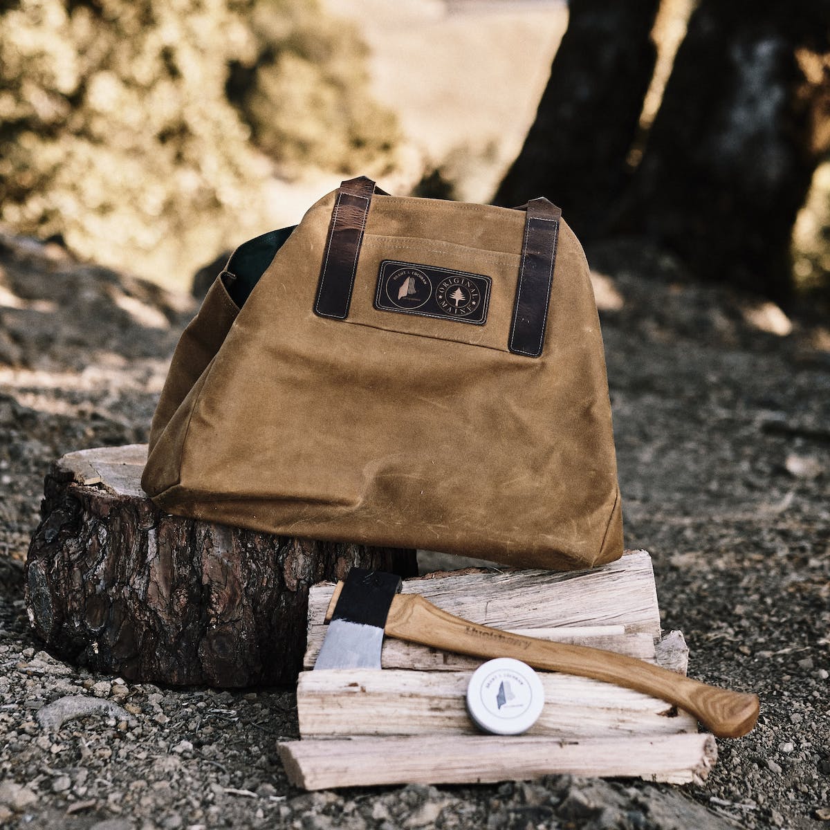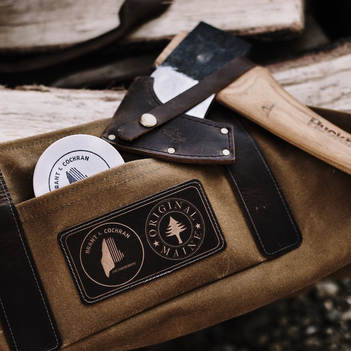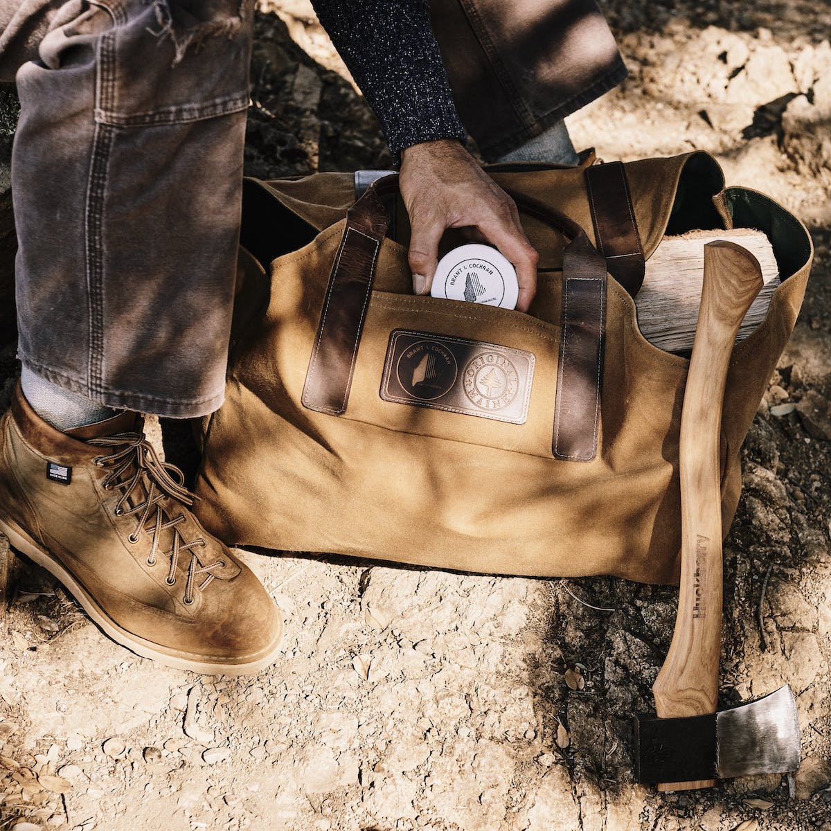 Based on a historically-accurate axehead loaned to Brant & Cochran by the Patten Lumberman’s Museum, this slice of Americana is the only Maine-pattern wedge axe being crafted today. This bundle also comes with a custom collab log carrier—made from Flint and Tinder’s waxed canvas—with thoughtful design elements engineered to tote all your other fire-starting accessories.