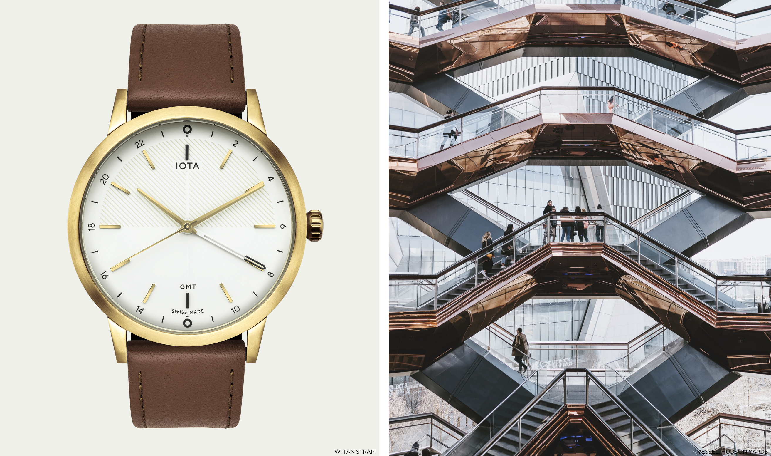 From the townhouses of Queens, the Brooklyn Bridge and the Flatiron building to the golden shades of Bethesda Terrace in central park, the influences for the aesthetic of the New York GMT from Iota (£265) were many and varied. They drew inspiration from the light brownstone used across New York City. This culminated in a pairing of a tan strap with a golden case, contrasting against a crisp matt white dial that hosts a display of light golden lines. At the heart of the New York GMT is the ability to display two time zones on the dial. This is achieved using a GMT hand and 24 hour markers.