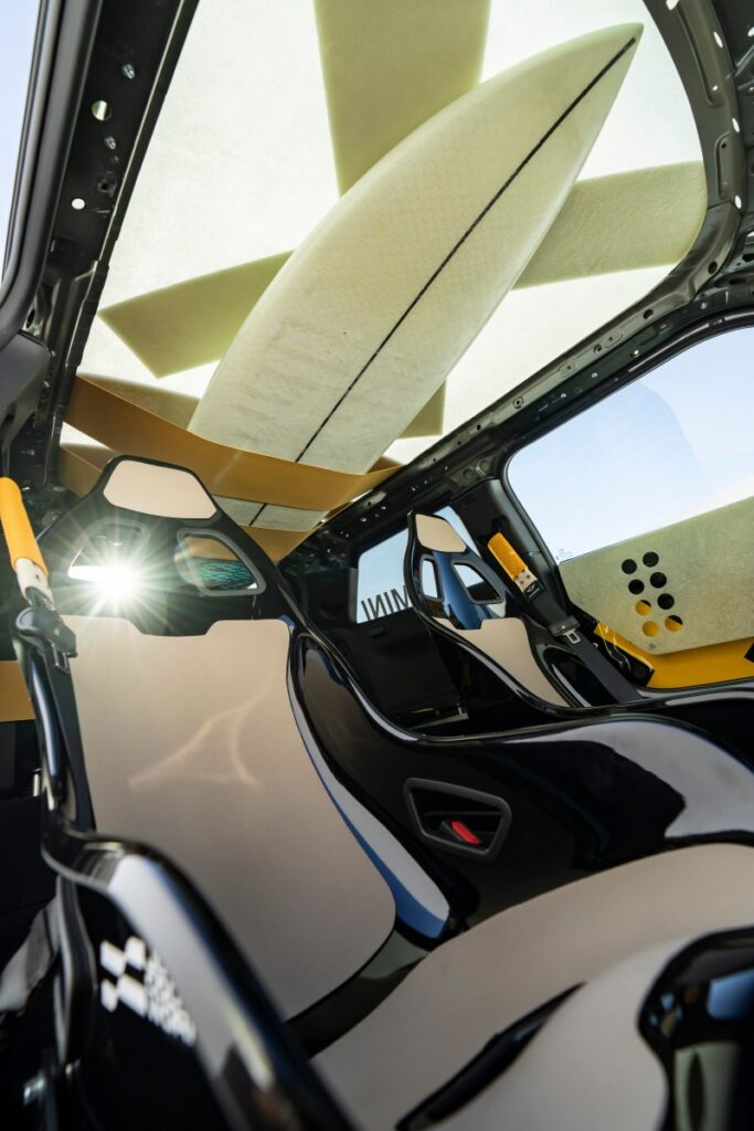 The first of the pair, named “The Skeg,” is a sleek, electric, and coast-bound machine. It’s a clean, quiet rebellion, drawing on materials, technologies, and philosophies from the world of surfing. The vivid yellow and silver bodywork is an immediate eye-catcher, a nod to MINI’s progressive take on electric mobility.