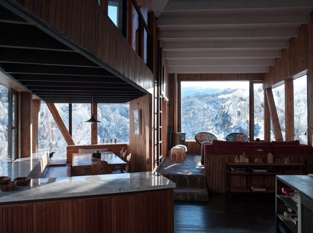 The La Dacha Mountain Refuge from DRAA Architects is nestled in amongst native woodland and overlooks the spectacular Nevados de Chillan volcanic complex, which makes the La Dacha Mountain Refuge an awe-inspiring property that is the result of a site-specific design which effortlessly combines space programming with high-thermal efficiency. This 140-square-metre cabin has a V-shaped design and rises up from a half-hectare site dotted with trees. The building is positioned in such a way that makes the most of the path of the sun, while a highly insulated perimeter and a thermally massive core make it as energy efficient as possible.