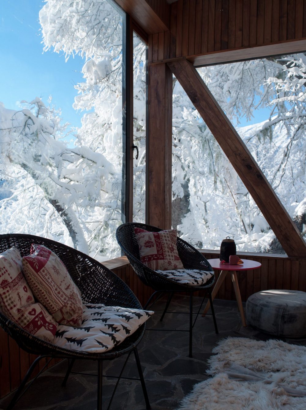 One of the most visually arresting features of the La Dacha Mountain Refuge is the fact that the exterior walls are clad in pine planks which have been charred using the Japanese technique of shou sugi ban to deliver an immeasurably cool aesthetic. Burning the wood helps increase its resistance to insects and decay – something which is important when a property is in what can be a pretty harsh environment at various points during the year.