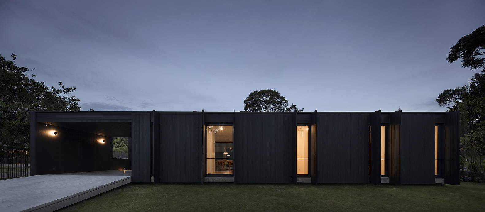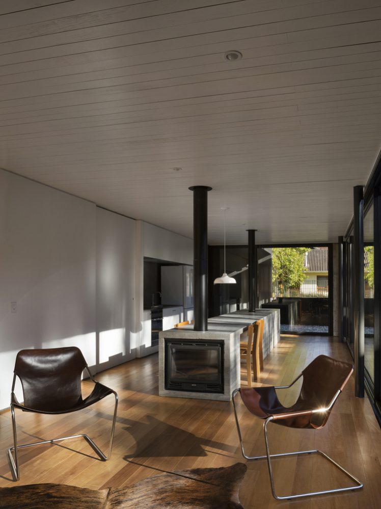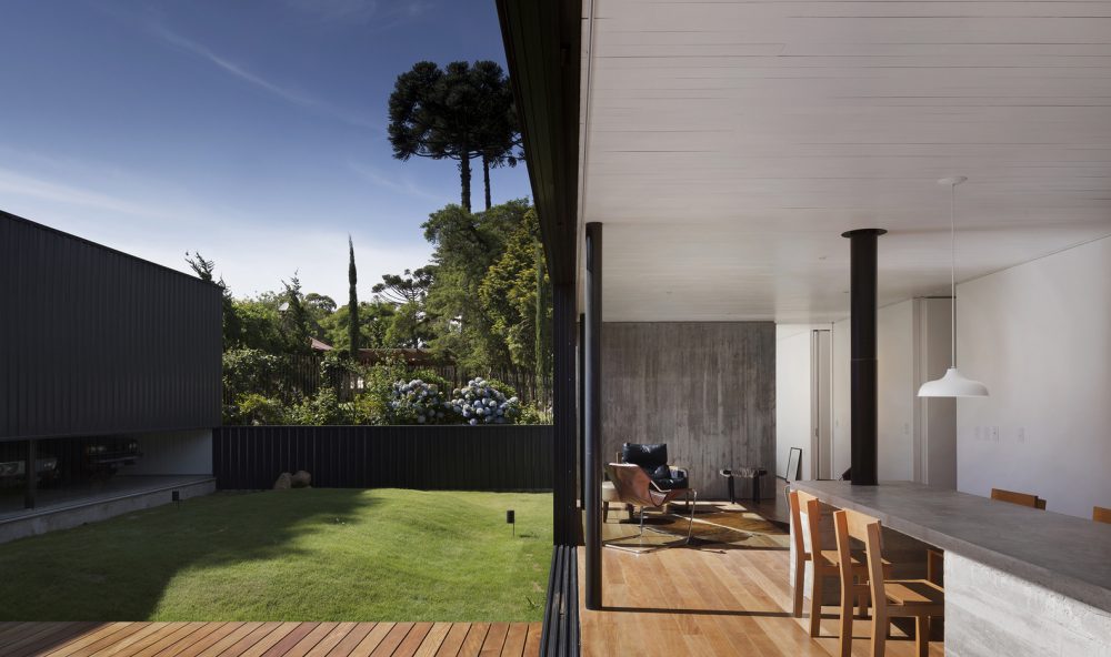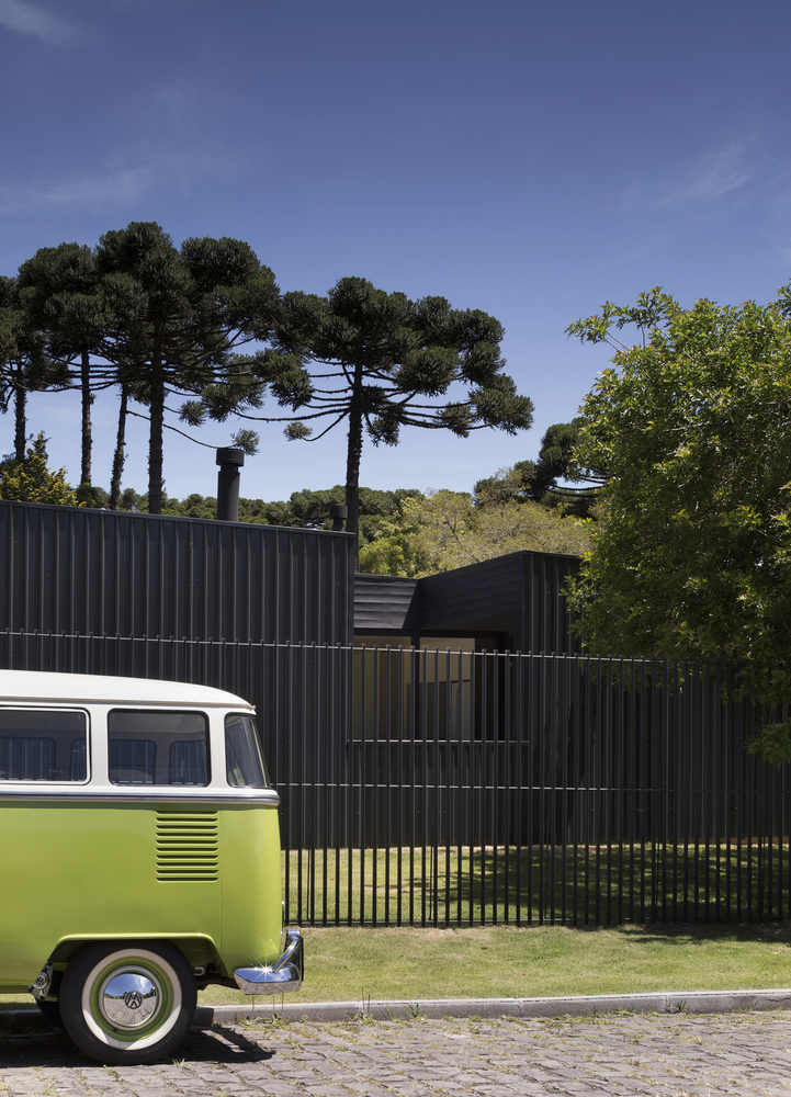 The restricted budget for the build of the Lata House influenced the selection of materials and technologies used in the build. The focus was the viability of the project as well as a reduced maintenance cost. The design joins together a concrete structure for the base and a metallic structure for the columns and beams. The exterior walls and the roof are cladded with the same metal roofing panels, which, along with the wooden cladding in the main facade, compose a monolithic volume.