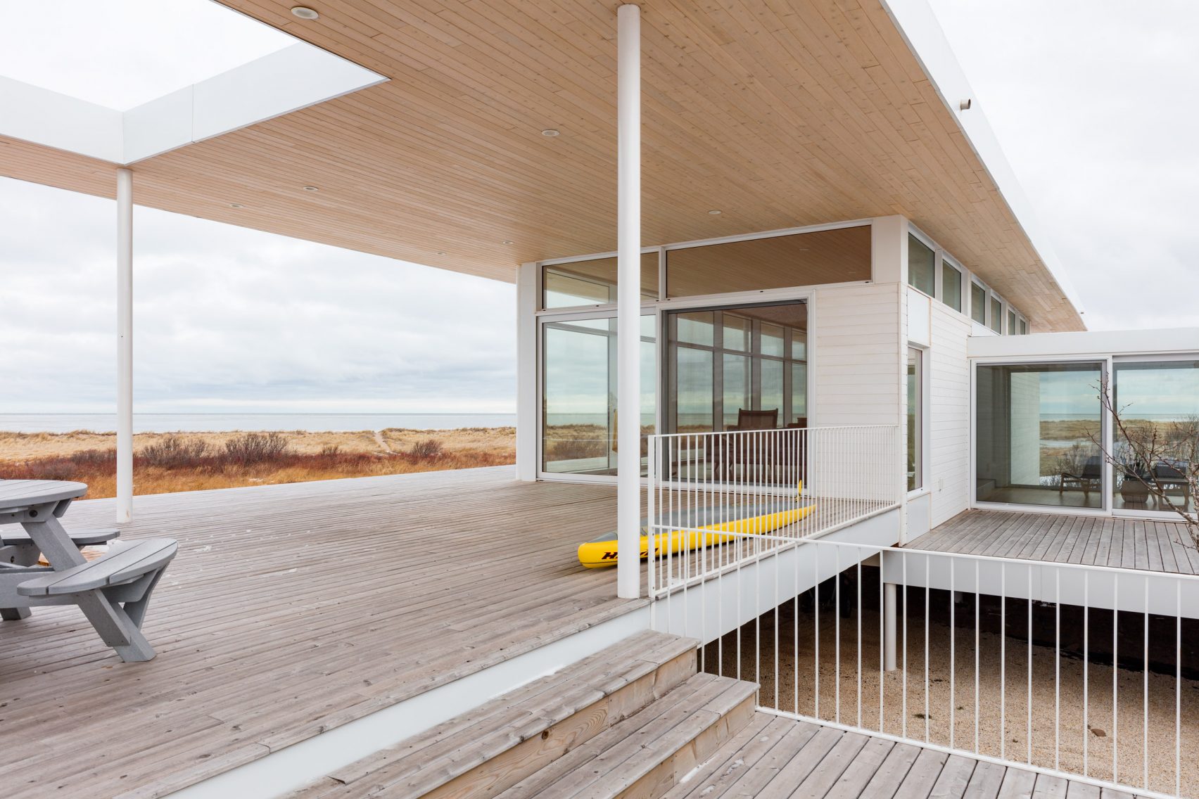 It is the living spaces of the Leblanc Residence that really excel and they open out onto a wide deck, which is partially covered by the projecting roof structure. The outdoor space of the home benefits from a screened porch which occupies the eastern end of the terrace and allows for a sense of outdoors when you’re sitting within. A series of steps runs the entire length of the home to provide additional seating overlooking the glorious views of the Atlantic Ocean.