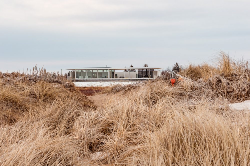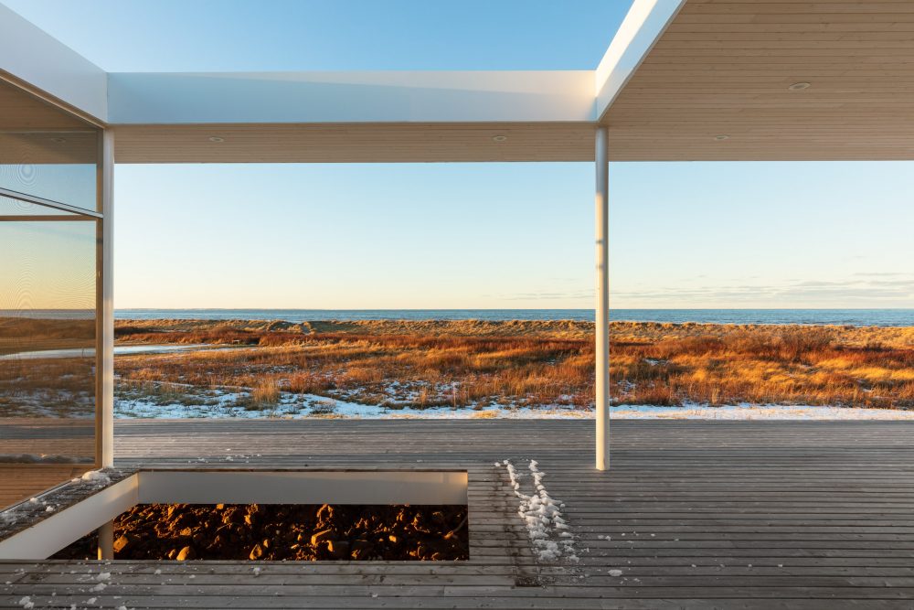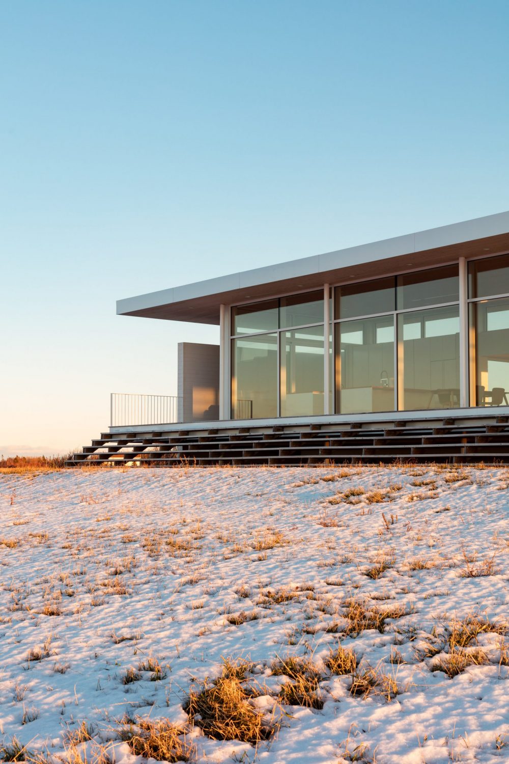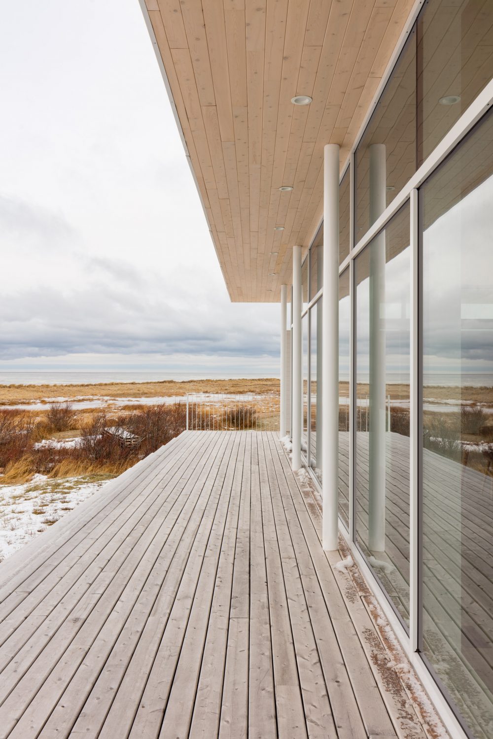 The architects behind the Leblanc Residence designed the home as two separate pavilions that are protected by a wide, overhanging roof – a form that is intended to blend in with the horizon beyond. It has steel columns which are there to support the roof and are painted white to bolster them against the salty Atlantic air’s corrosive effects. The first of the structures is more opaque and enclosed, and is where you’ll find the home’s three bedrooms along a corridor. It also has the main entrance, which features a glazed passageway that offers views to the ocean.