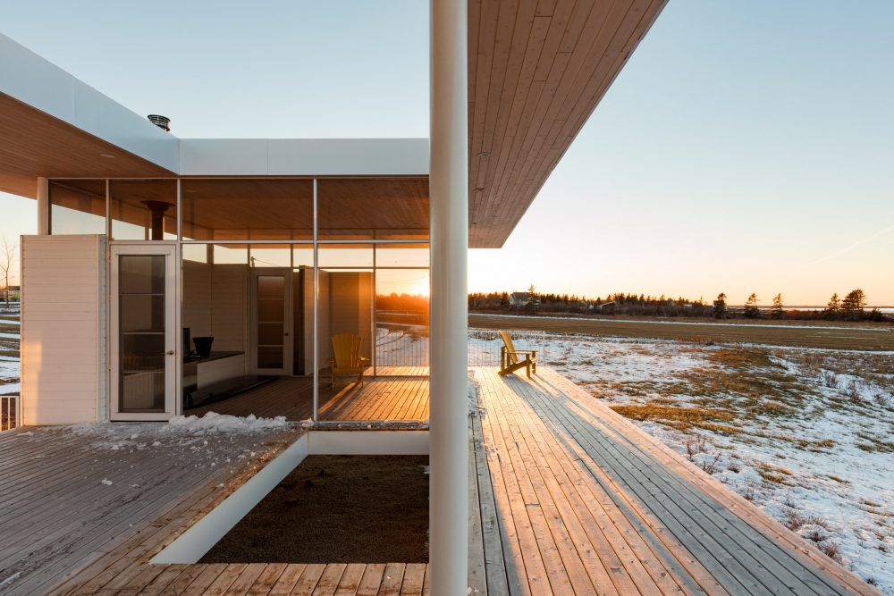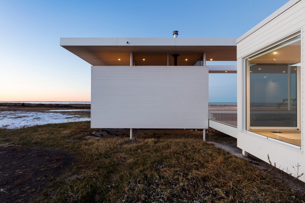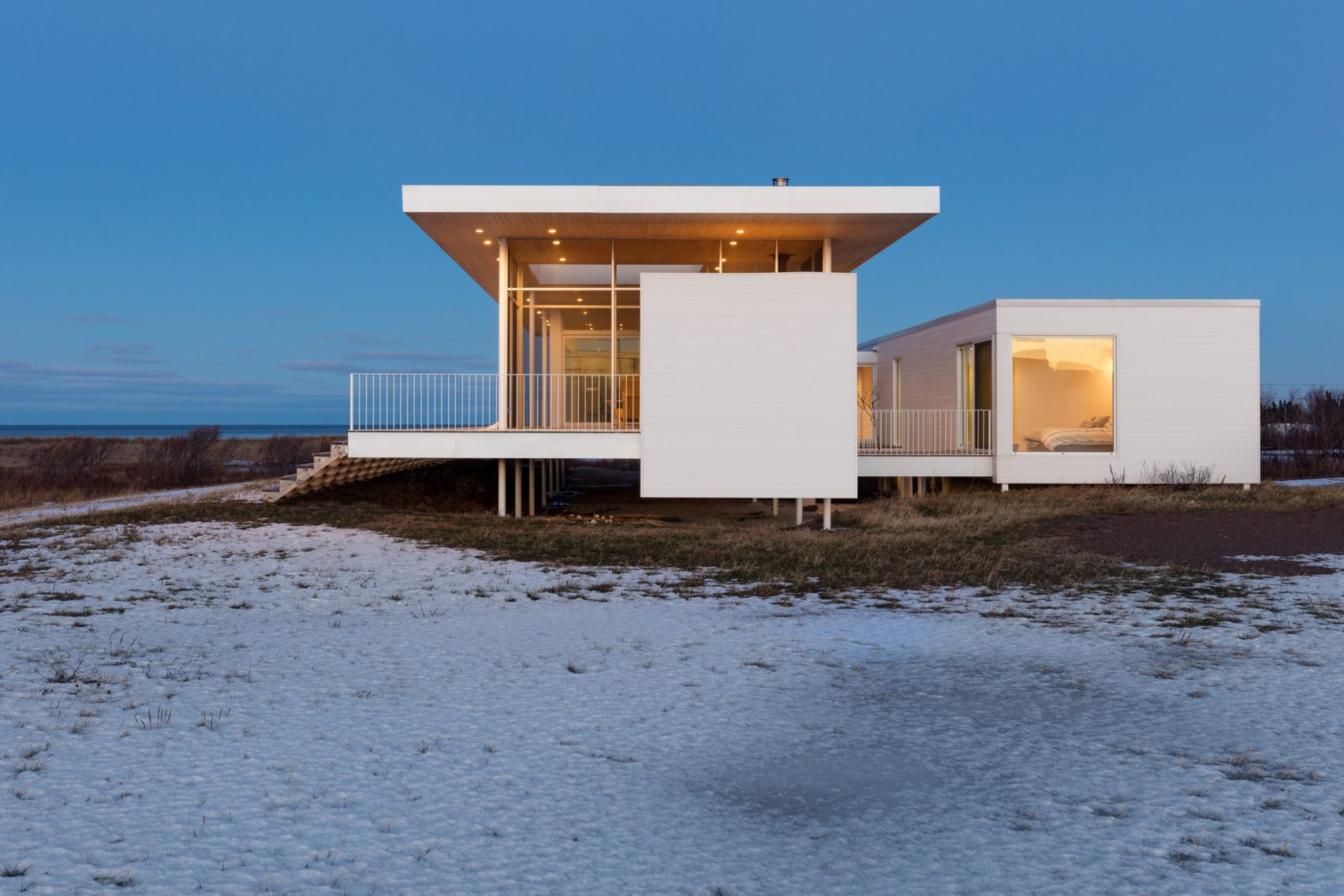 The Leblanc Residence has a very low slung profile that doesn’t impact at all upon the rural, relatively baron landscape in which it is located. It can be found in Grand-Barachois, a remote village in the province of New-Brunswick which overlooks Canada’s Northumberland Strait. The reason Leblanc Residence is elevated is to allow for the pools of water that gather around the house to flow underneath without damaging the interiors and the wooden clad the exterior and these are painted white to help protect them from the sea air.