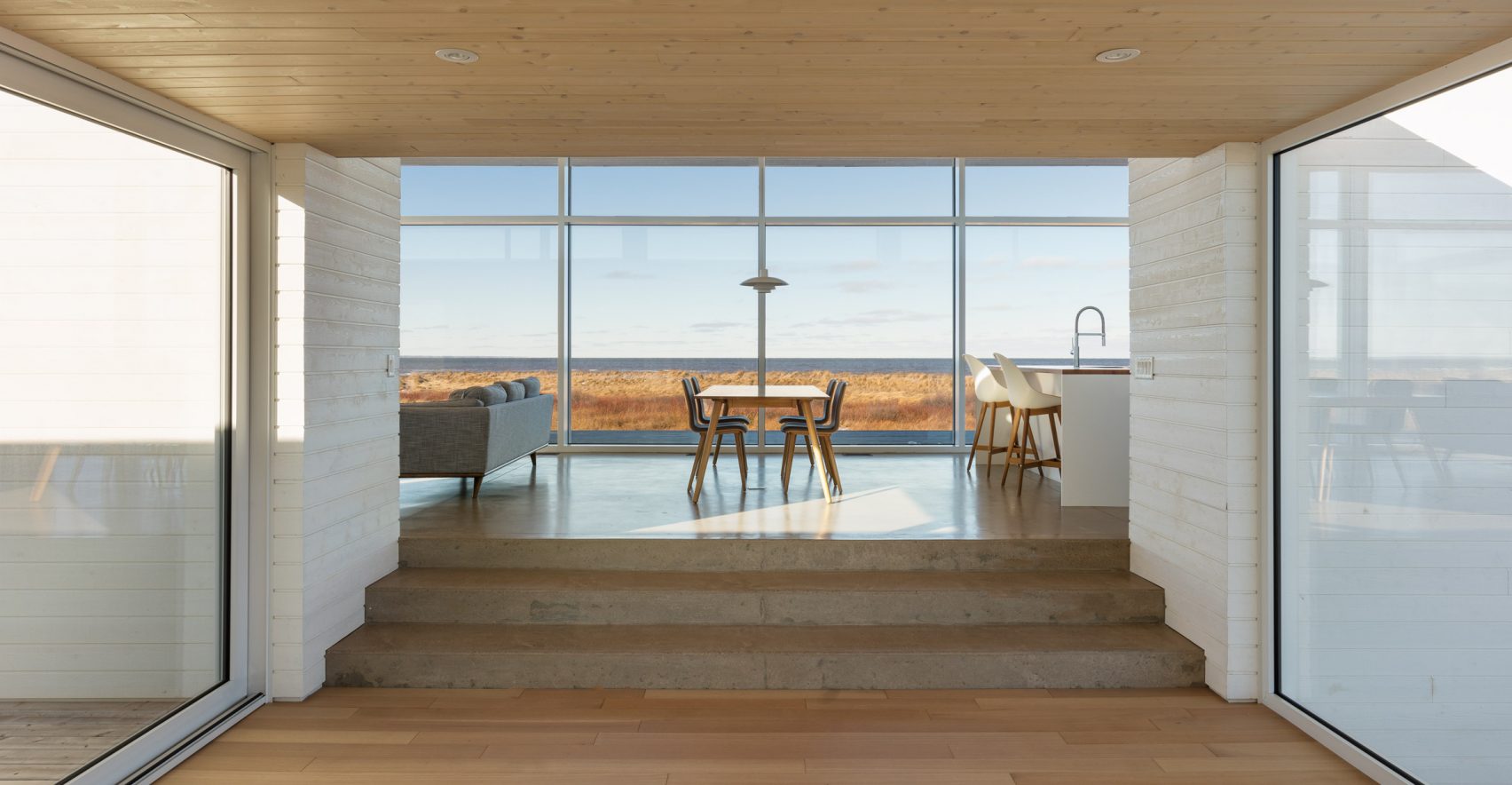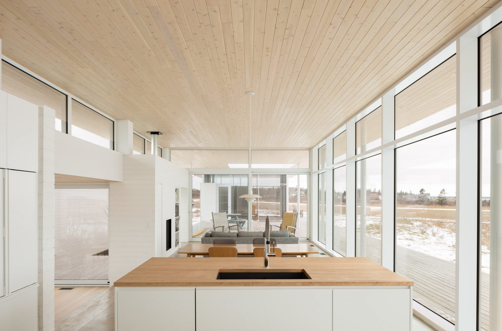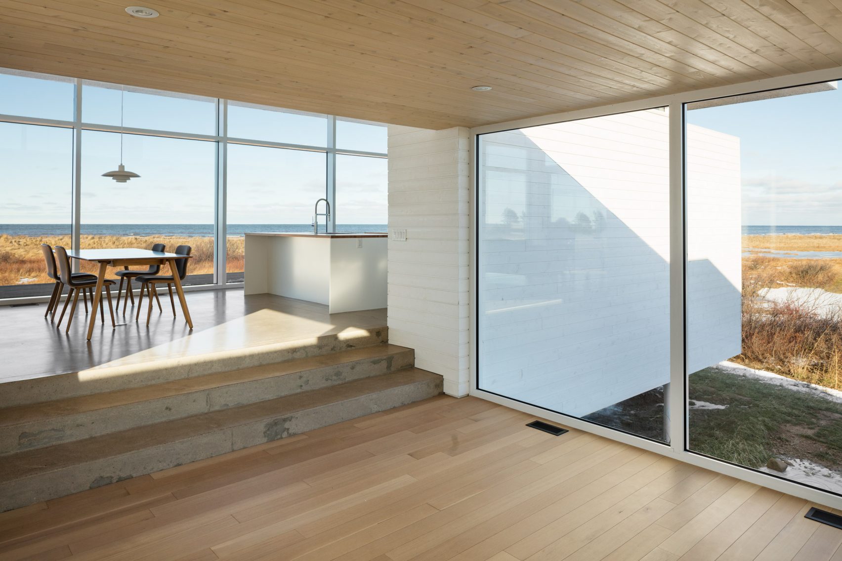 In order make the Leblanc Residence as private as possible given its beachside location, the bedrooms have limited openings to the landscape. Instead, they overlook a courtyard between both halves of the homes, which is where you’ll also find an interior garden, which is built around a tree to add a striking aesthetic impact to the home. The second pavilion, which is amply glazed and faces out towards the Atlantic Ocean, is the perfect counterbalance to where the bedrooms are found. Three concrete steps lead from the entrance foyer to an open kitchen, living and dining room with expansive views of the maritime landscape.