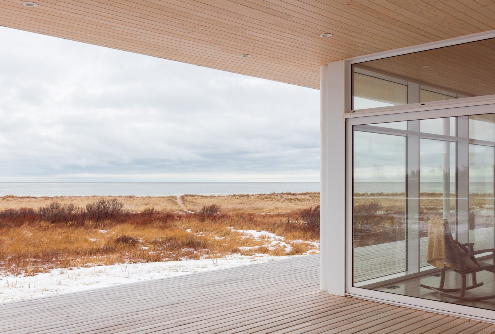 It’s fair to say the Leblanc Residence is more suited to those who love the bracing sea air of the Atlantic as opposed to beach days in the sun and it has a cleverly designed layout that makes the most of its unique spot on the Canadian coast. All the materials used in the build had to be carefully chosen so as to age well in a challenging climate and the long exterior deck that fronts the house has been left untreated so that it will turn to a silvery grey colour over time.