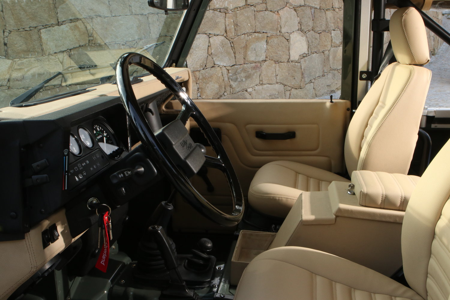 The Legacy Overland Land Rover Defender 90 Soft Top comes in Keswick Green and is well protected by a Safety Devices roll cage and nudge bar to the front of the vehicle. The passengers are also protected from the elements by a European-style canvas soft top which adds a real touch of class to the visuals. If you linger at the beach and the sun starts to set, the extra-large auxiliary lights up front, round indicator LED lights front and rear, will certainly assist you in lighting the path ahead and navigating your way back to the road.
