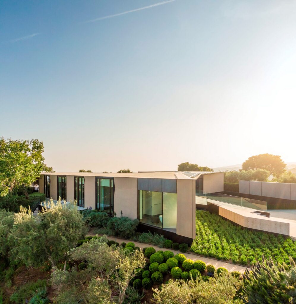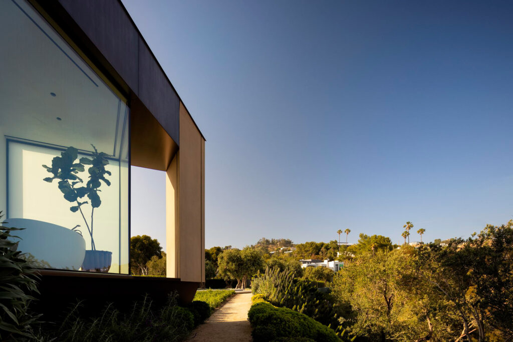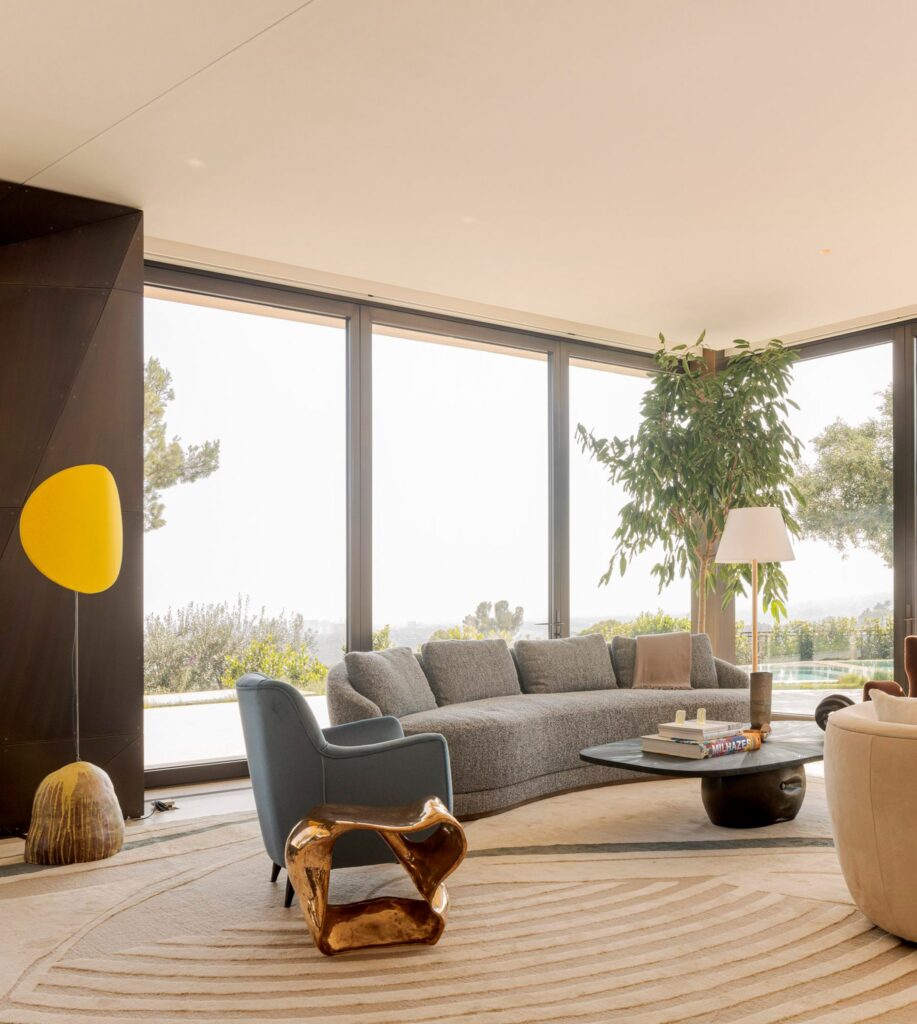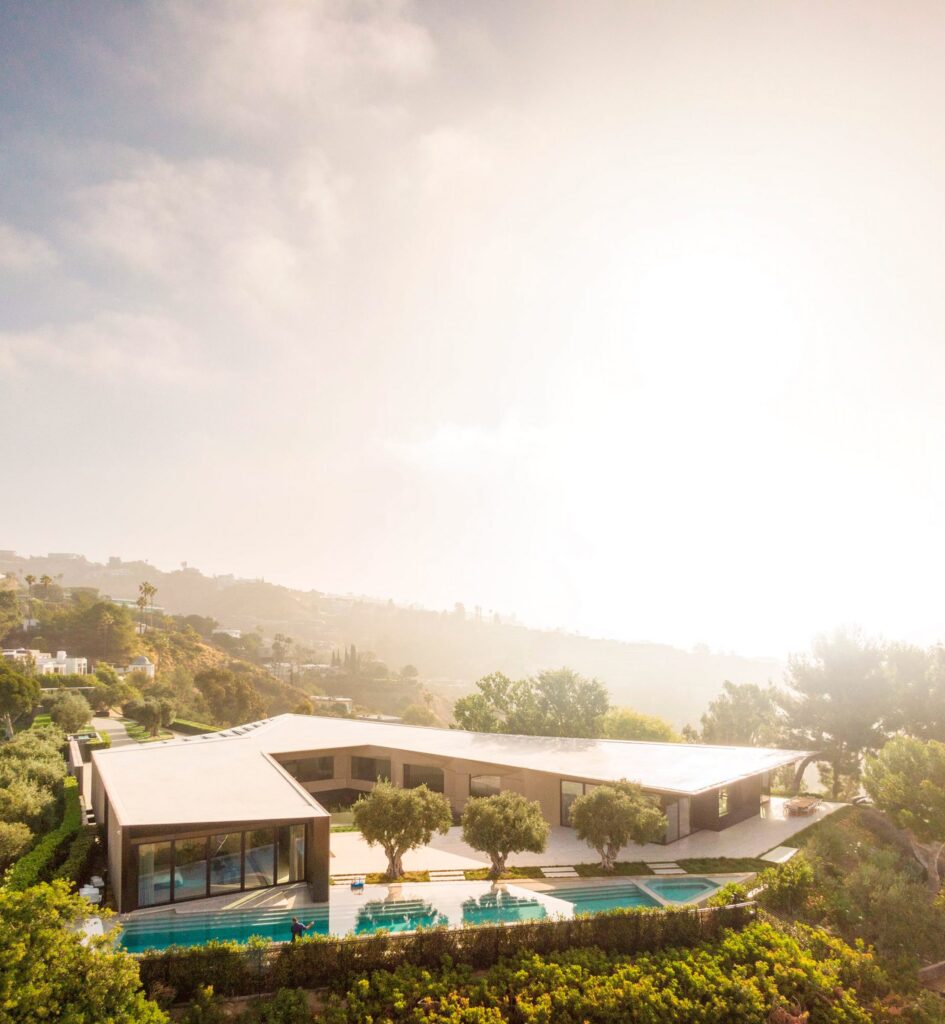 Perched on a two-acre promontory, the home commands sweeping views of downtown Los Angeles and the ocean, yet it remains surprisingly grounded. This is partly due to local regulations in Trousdale that cap building heights at 14 feet to protect neighbors’ views.
