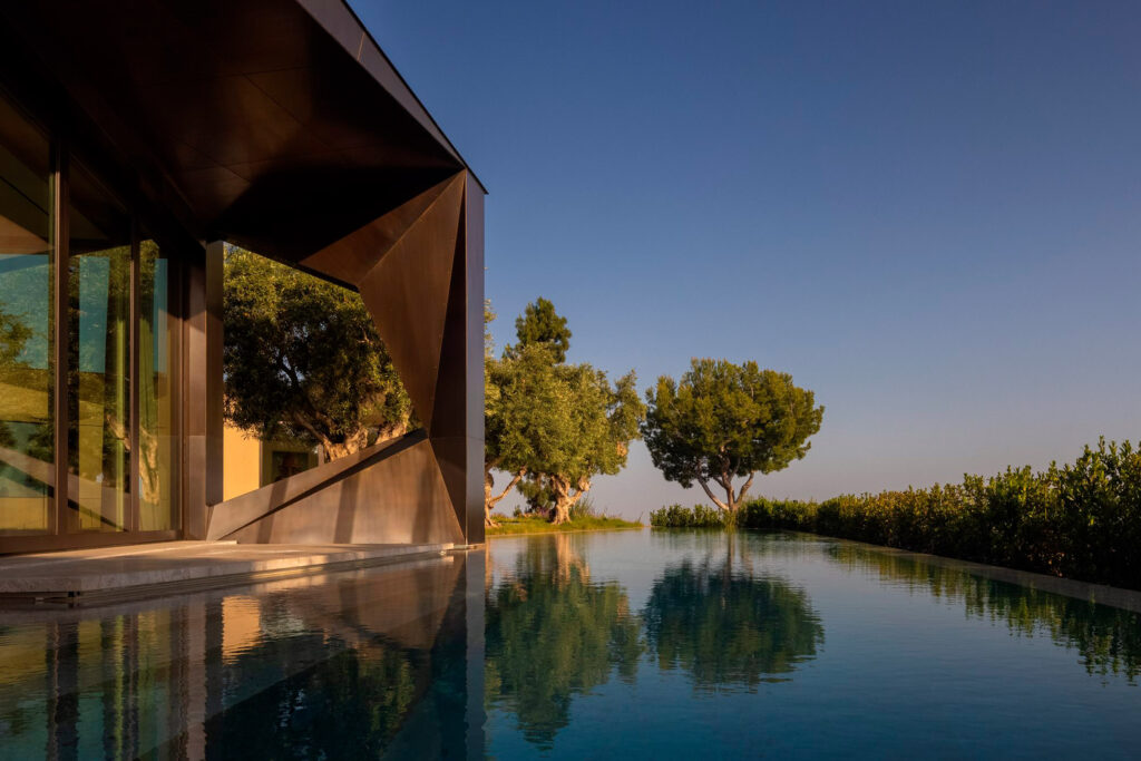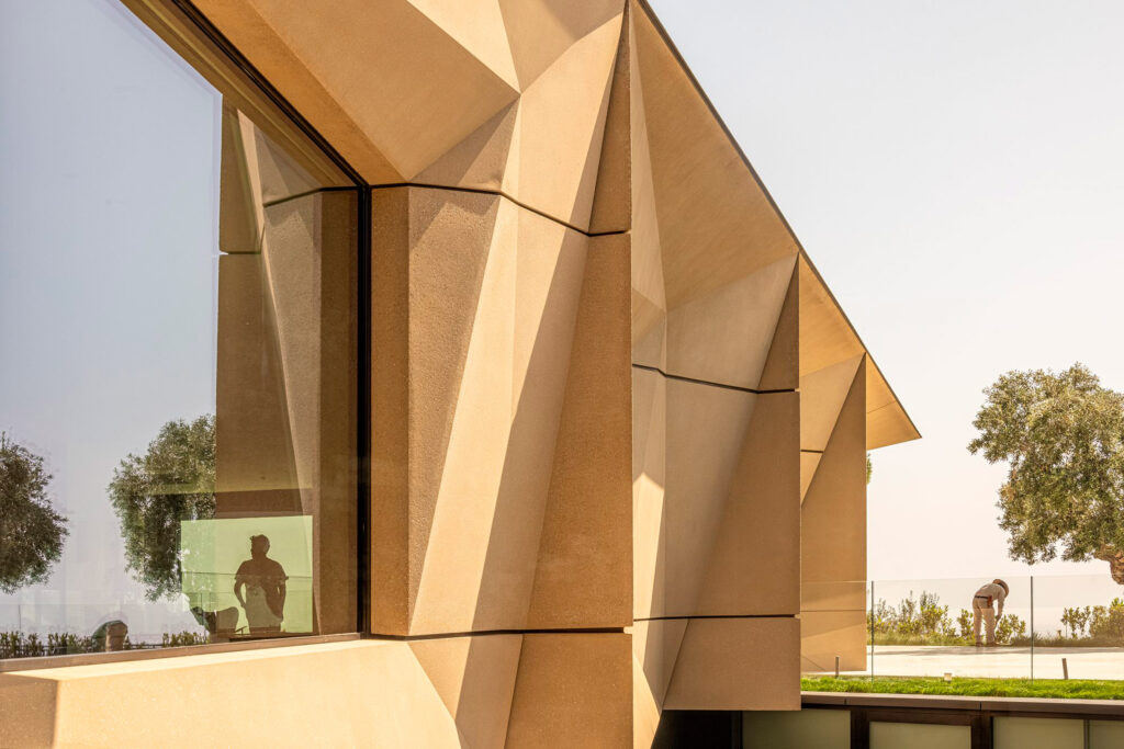 This concept birthed a V-shaped floor plan and, most notably, the building’s striking exterior. The house is wrapped in a “fractal” skin, a series of folded, angular planes that give the structure a sense of movement and depth rarely seen in residential architecture.