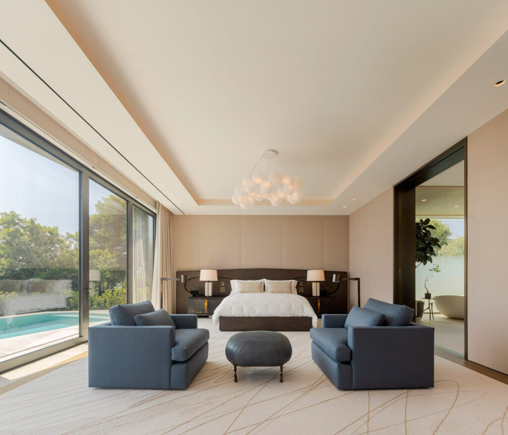 Inside, the residence is split between a sprawling single level and a subterranean basement, both designed to maximize light and flow. The upper floor is organized around the V-shape, hugging a central courtyard and a swimming pool that serves as the focal point of the outdoor living space.