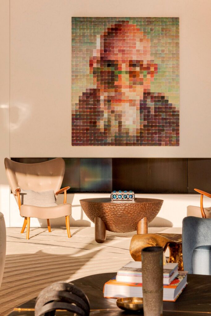 They introduced a palette of rich textures, neutral colors, and restrained furnishings that soften the angular architecture, making this massive geological sculpture feel like a warm, livable home.
