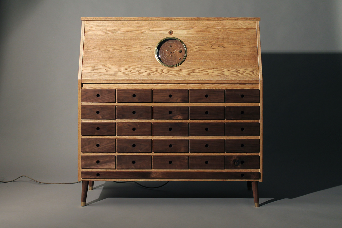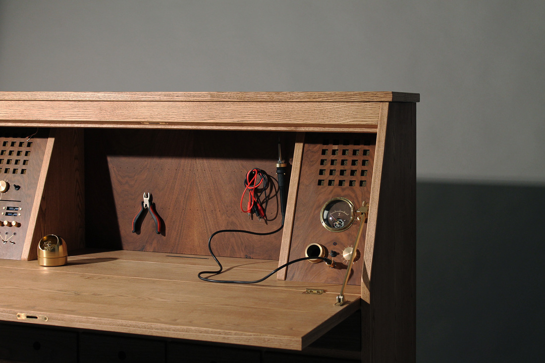 With an abundance of storage space (26 drawers), the 43 x 43 x 16-inch workbench successfully integrates a bevy of electronic apparatus which includes a built-in high-end computer along with a 2.1 speaker system that allows it to function as a high-tech working environment. On the inside of the Tempel Workstation, you’ll discover a motor driven hidden pop-up 24″ monitor covered in a striking walnut frame and a built-in soldering/electronic station with a selection of customised tools, crafted with the owner’s needs in mind.