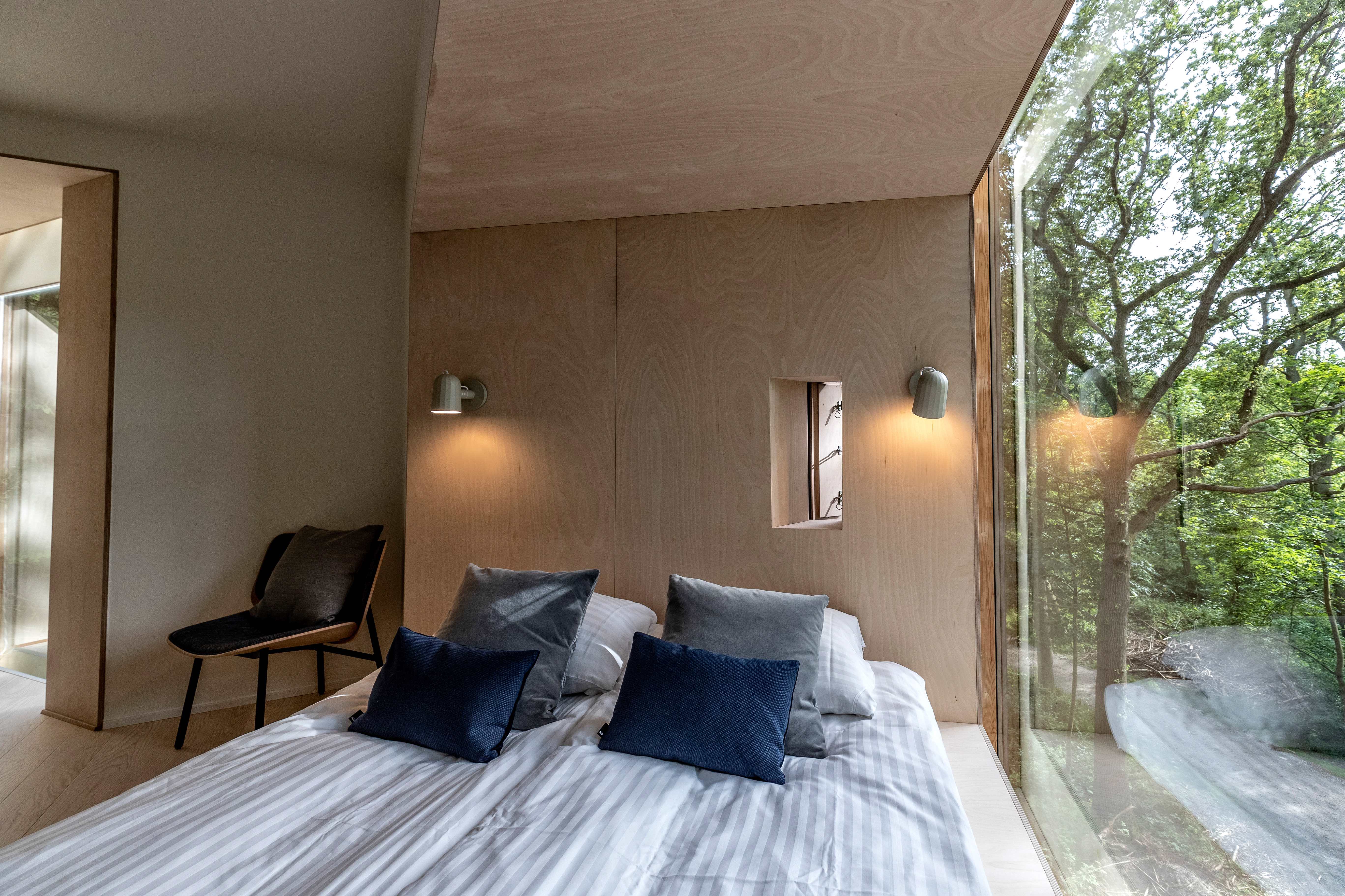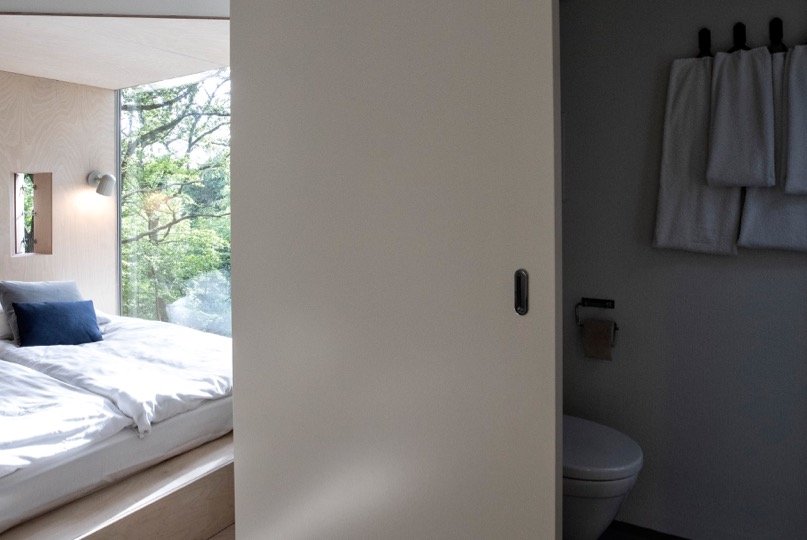 It is the interiors of these cabins that have a particularly Scandinavian feel with one large room with a sleeping area, a living room and kitchen as well as a separate toilet and outdoor shower under the canopy. The cabin has water, electricity and indoor plumbing so you’ll not be without the mod-cons that make for a more relaxing stay in the wilderness. The finished cabin has a staircase which leads onto the terrace of the cabin roof where you can relax in the treetop, enjoy a salmon from Mariager Fjord or just take in the views of the forest.