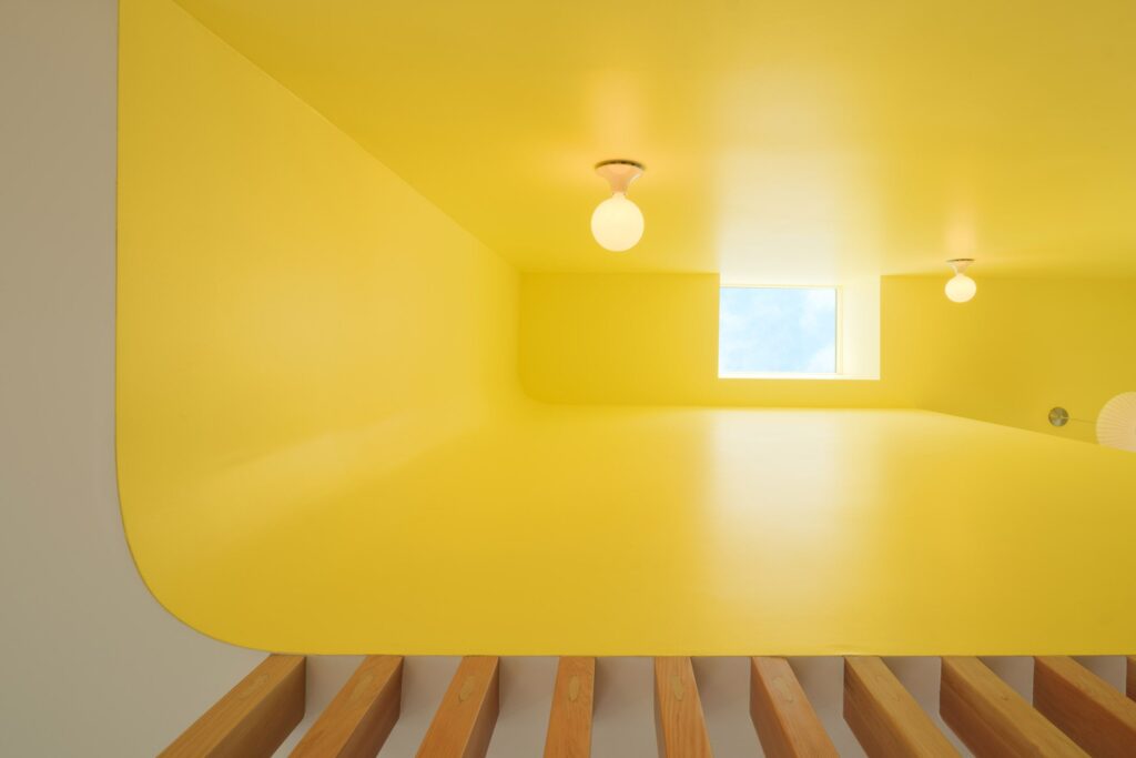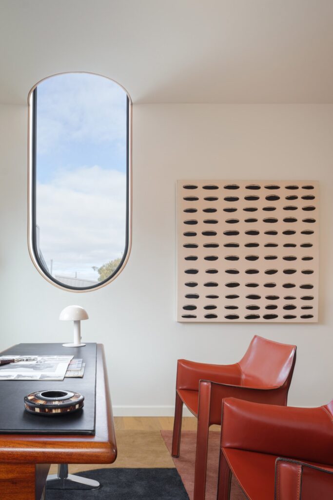 Connecting the two levels is an absolute showstopper of a stairwell. This slender transition space is bathed in natural light from a skylight, painted a vibrant, energetic yellow, and lined with beautiful white oak slats. Upstairs, you will find a versatile office that easily doubles as a guest bedroom.