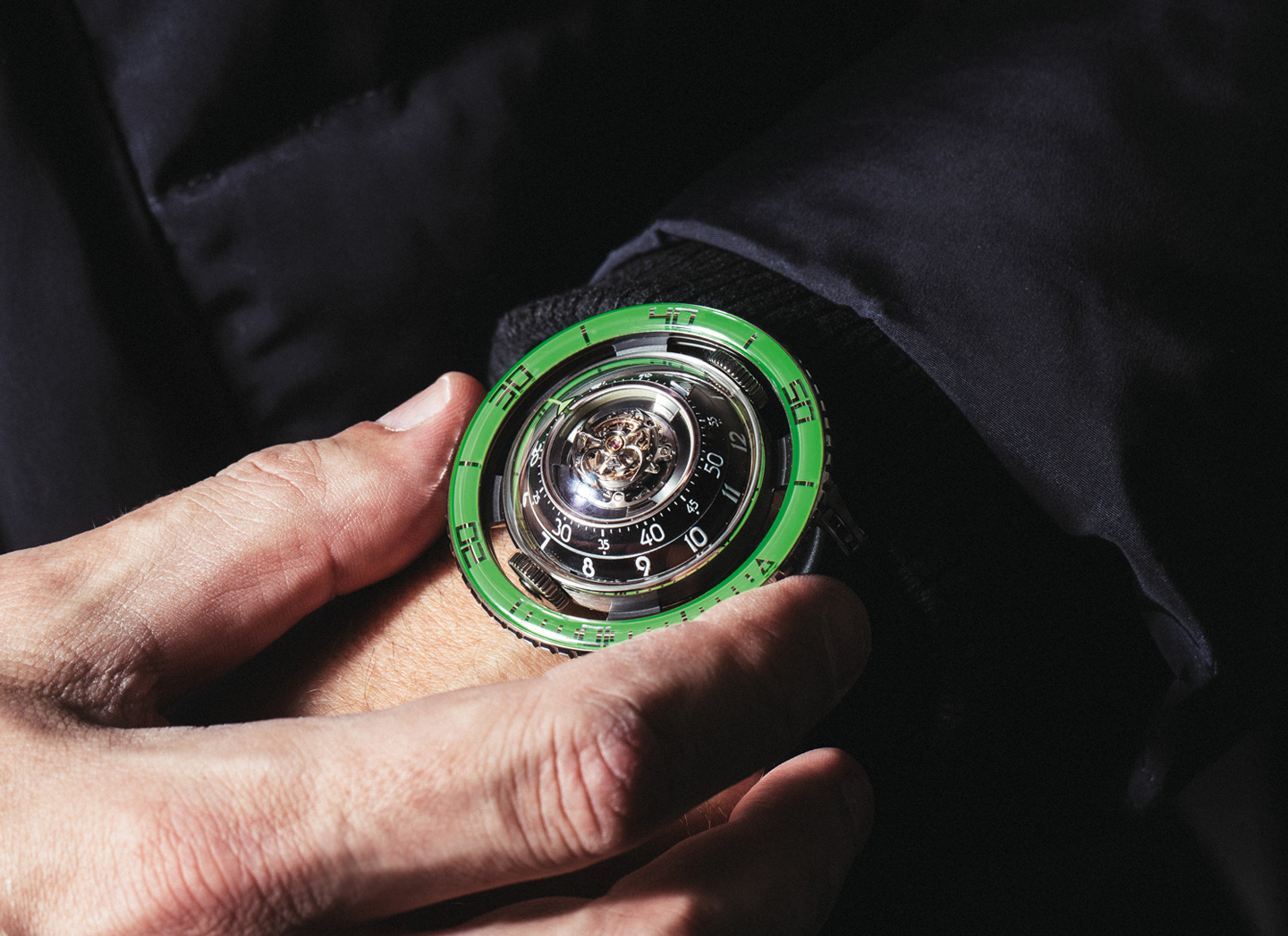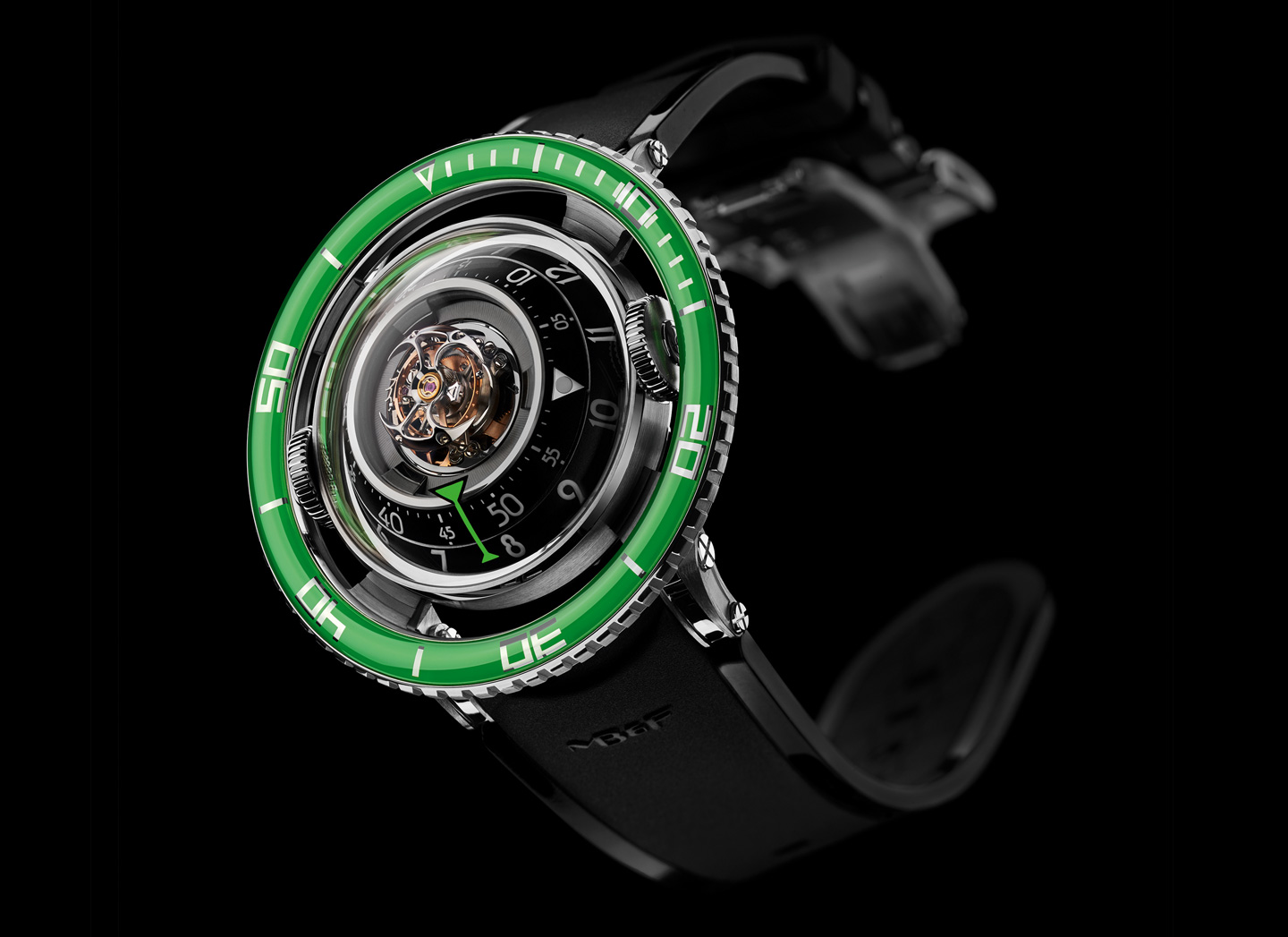 The MB & F HOROLOGICAL MACHINE N°7 Aquapod Watch is certainly a statement accessory that will turn heads aplenty with its mesmerising construction and movement that has to be seen to be believed. The organic jellyfish-inspired design of HM7 Aquapod is counter-balanced by the extremely mechanical horology to be found within: a central 60-second flying tourbillon tops the concentric vertical movement architecture, with indications radiating out from the centre like ripples in a pond in what must be one of the most visually impactful movements seen in a wristwatch.
